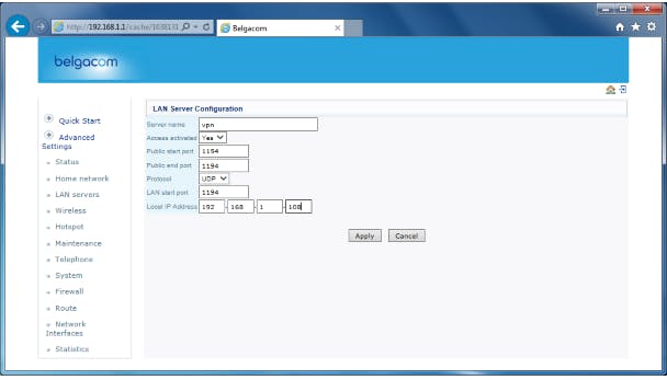 De Raspberry Pi is pas vanaf buiten je thuisnetwerk bereikbaar als je poort 1194 op je internetmodem/router laat doorsturen (forwarden) naar je Pi. Daarvoor moet je op de beheerpagina van je internetmodem/router naar de functionaliteit voor port forwarding gaan. In sommige interfaces heet dit 'LAN servers' of iets dergelijks. Geef de regel een naam (bijvoorbeeld 'vpn'), geef als poort 1194 op (of wat je in de OpenVPN-serverconfiguratie gekozen hebt), als protocol UDP en als lokaal IP-adres het interne IP-adres van je Pi.