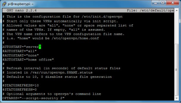 Om nu OpenVPN te starten, moeten we naar het juiste configuratiebestand verwijzen. Voer daarom nano /etc/default/openvpn uit en voeg AUTOSTART="server" toe. Als je eerder in deze workshop een VPN-router van je Pi gemaakt heb, moet je de AUTOSTART="client" hierdoor vervangen. Sla op en sluit af met Ctrl+O en Ctrl+X. Laat OpenVPN daarna automatisch starten bij het booten met sudo update-rc.d openvpn enable. Herstart je Pi. Kijk dan in de basiscursus over VPN op hoe je op je client met je OpenVPN-server verbindt.
