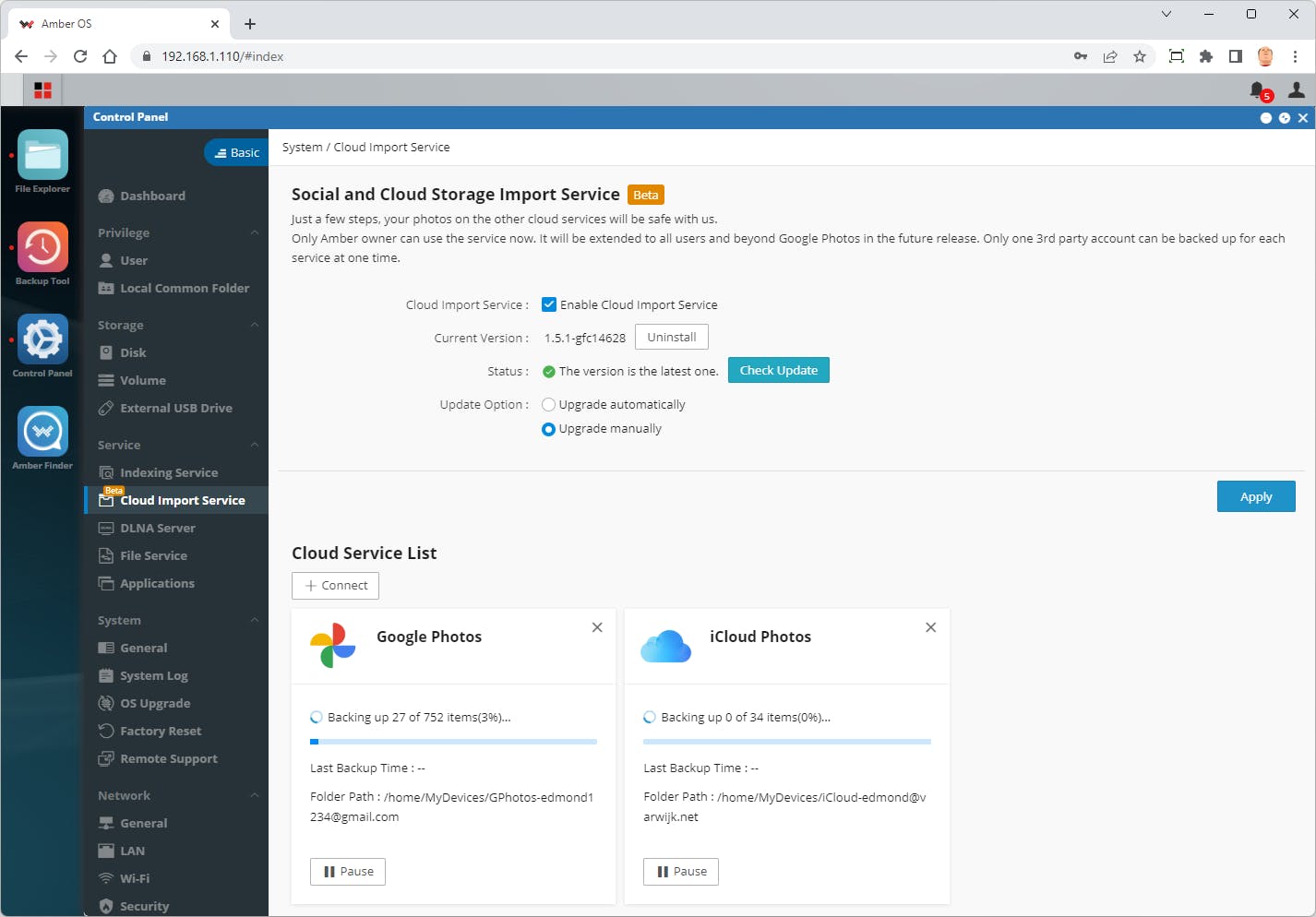 Diezelfde Amber PRO kom je ook tegen wanneer je met de webbrowser inlogt op de Amber X. Want al ontbreken enkele PRO-functies zoals de ingebouwde router en de mogelijkheid via Docker extra applicaties aan de NAS toe te voegen, andere functies zijn er wel. Zo is er een handige bestandsbrowser en biedt het Control Panel opties die in de app ontbreken. Denk hierbij aan het configureren van de bestandsindexering, een DLNA-mediaserver, synchronisatie met iCloud en Google Drive en zelfs het installeren van uitbreidingen. Net als de Amber PRO ook hier geen bomvolle appstore, maar de bescheiden keuze uit Zwave JS UI en Home Assistant voor het aansturen van slimme apparatuur en de Plex mediaserver.
