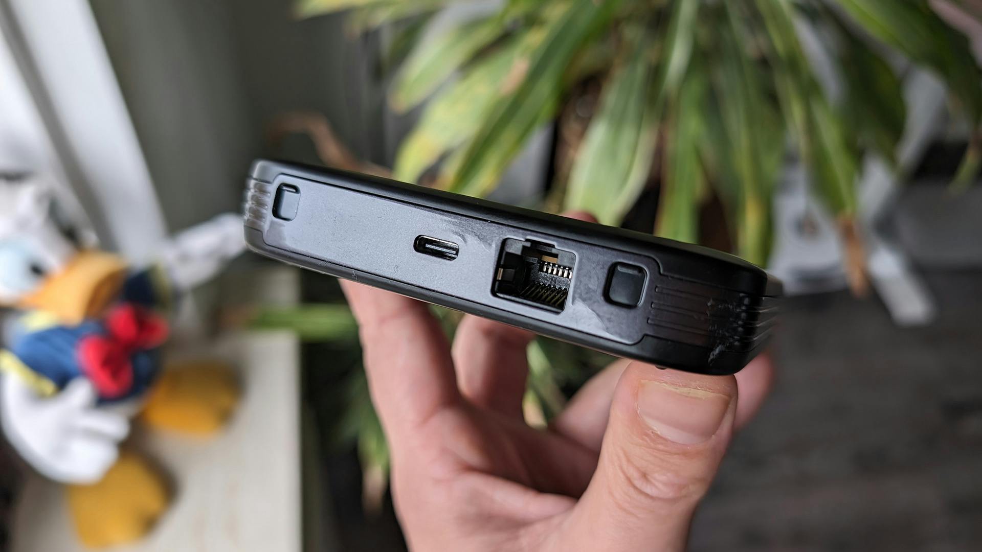 Achterop zit er een paneel dat je heel gemakkelijk loshaalt, maar dat er niet gemakkelijk vanzelf af komt. Daaronder tref je de oplaadbare accu (die je er zelf in moet doen voordat je hem kunt gebruiken) en een simkaartsleuf. Verder beschikt de Netgear Nighthawk M6 Pro over een usb-c-poort (voor het opladen en usb-tethering), een ethernetpoort (zodat je niet afhankelijk bent van een draadloze verbinding) en extra aansluitpunten voor antennes (die niet in de doos zitten).