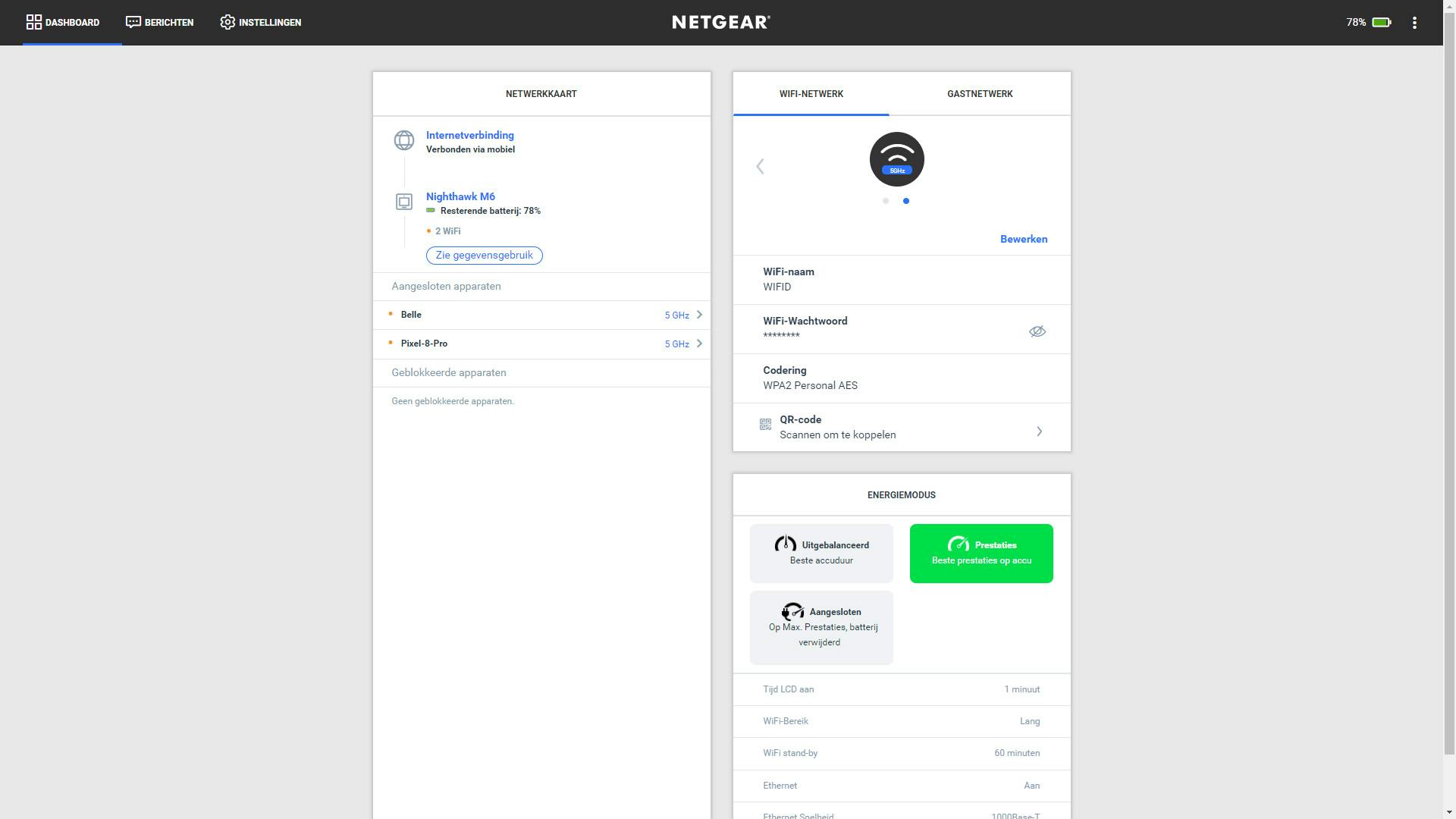 Een belangrijke punt om te noemen is de accu die hierin een rol speelt. Normaliter gaat de Netgear Nighthawk M6 Pro zo’n dertien uur mee op een volle lading. Dat is genoeg voor een werkdag on the road. Maar dan gaan we uit van drie dingen; dan stel je de mifi-router in op alleen 5GHz, houd je het bereik beperkt (dat is uitbreidbaar) en staat het energieprofiel op Uitgebalanceerd. Wanneer je overschakelt naar het profiel voor prestaties, dan schiet de snelheid soms naar 190 Mbps.