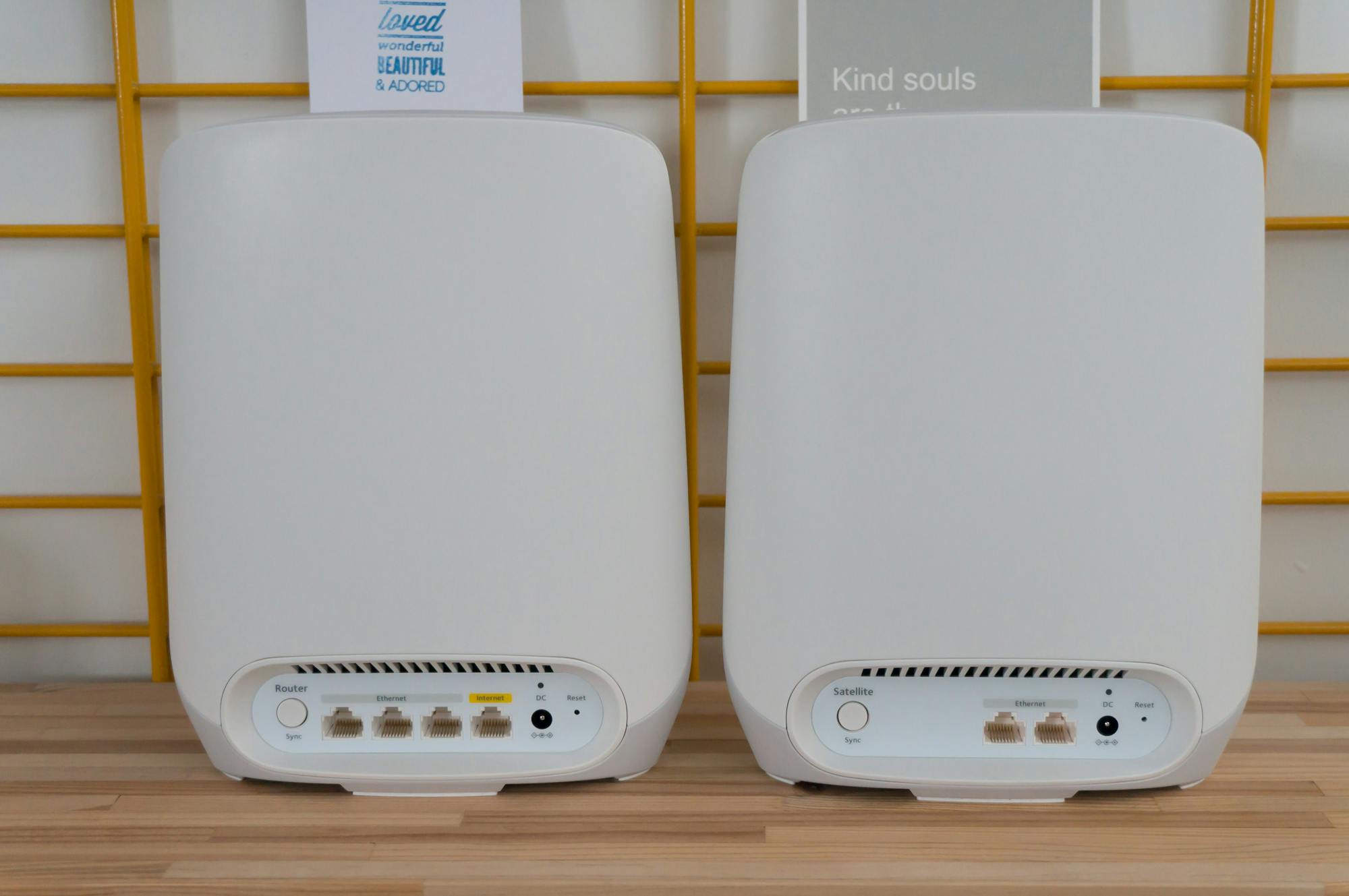 Ook het fysieke ontwerp is anders en compacter dan de voorganger. Waar de torentjes van de RBK753 23,1 cm hoog en 18,3 cm breed zijn, is dat bij deze set 21,1 cm hoog en 16,5 cm breed. Dat zorgt optisch voor een stuk aantrekkelijkere torentjes die door een andere kleurstelling ook minder opvallen dan hun voorgangers. Want waar de behuizing van de RBK753 nog was voorzien van zilveren accenten is dat bij deze set gewijzigd naar heel lichtgrijs. De aansluitingen zijn hetzelfde gebleven. De router is voorzien van een gigabit-wan-aansluiting en drie gigabit-netwerkaansluitingen, terwijl de satellieten voorzien zijn van twee gigabit-aansluitingen.