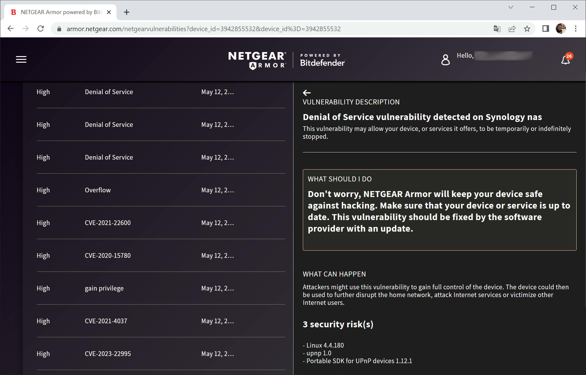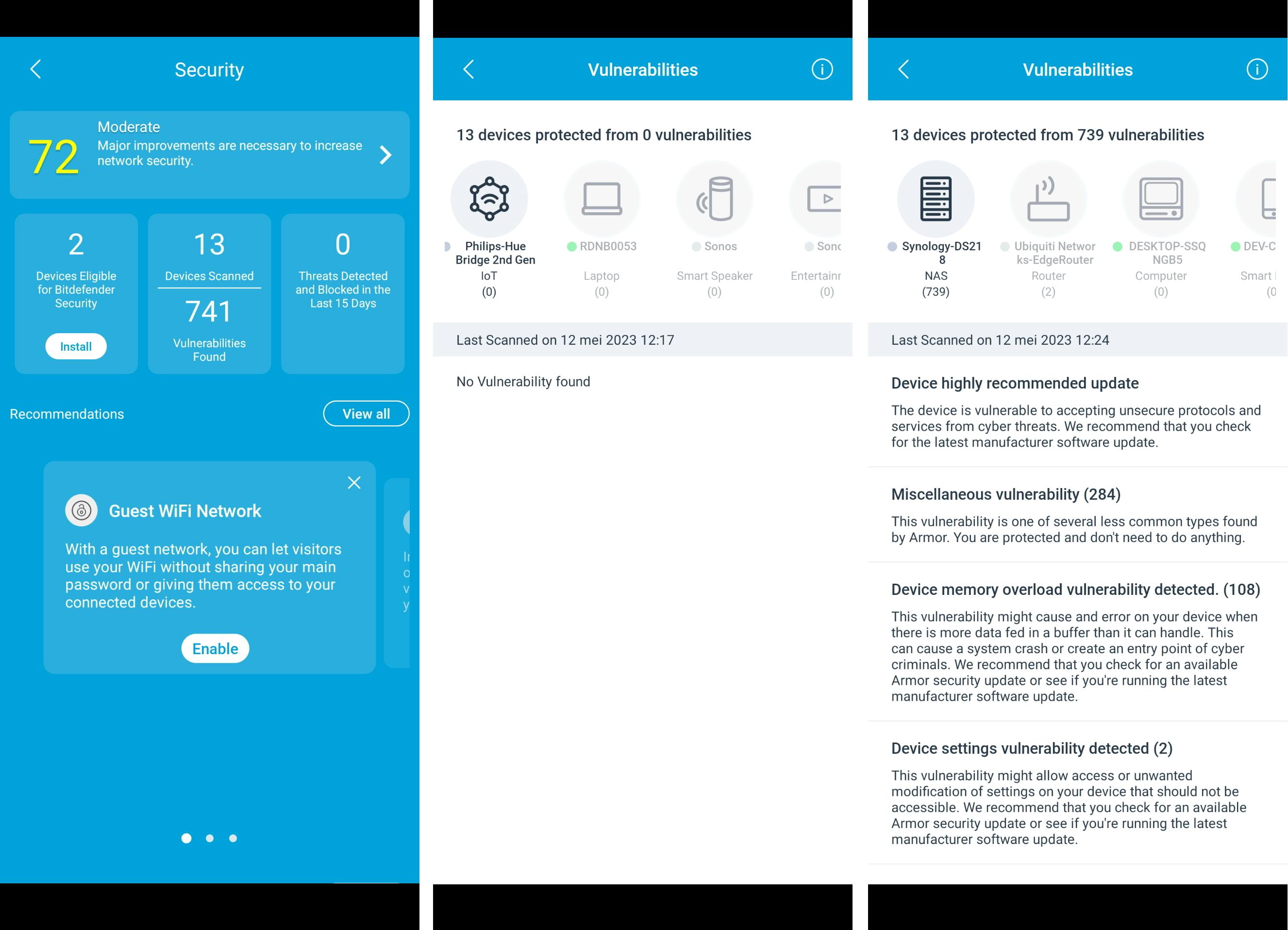 Netgear bundelt de mesh-systemen met een s in het typenummer inclusief 1 jaar gratis Netgear Armor. Dit is beveiligingssoftware op de router in samenwerking met Bitdefender die je netwerkapparaten scant op mogelijke gevaren en je laat zien welke apparaten volgens Netgear onveilig zijn. De meeste van de apparaten op ons thuisnetwerk worden als veilig aangemerkt, maar onze Synology-NAS is daarop een uitzondering. Volgens Armor heeft de NAS maar liefst 739 kwetsbaarheden en dat leidt uiteraard tot alarmbellen. Via de app krijg je alleen wat algemeenheden over deze kwetsbaarheden te zien. Op de Armor-website kun je gelukkig wel een uitgebreide lijst met gevonden kwetsbaarheden opvragen.