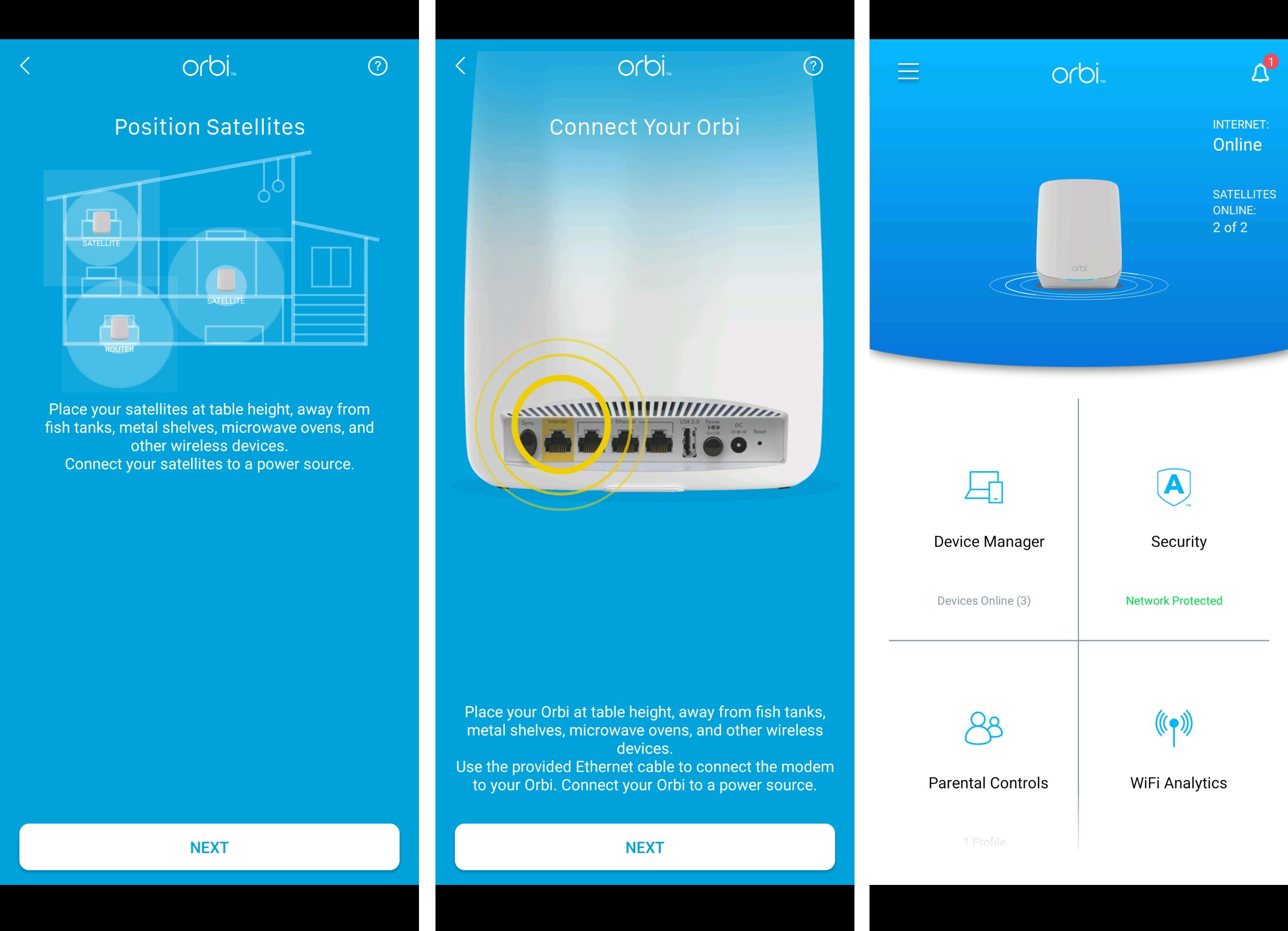 De installatie is het makkelijkst met de Orbi-app op je smartphone, je hebt hier wel een Netgear-account voor nodig. Je sluit de router aan op de gewenste plek en schakelt hem in. In de app kun je vervolgens de QR-code op de sticker scannen, waarna je door het eenvoudige installatieproces geleid wordt. Het systeem kun je vervolgens met de app beheren, maar daarin vind je voornamelijk basisfunctionaliteit zoals je wifi-wachtwoord, een overzicht van clients en de mogelijkheid om internet op appraten met ouderlijk toezicht te pauzeren.