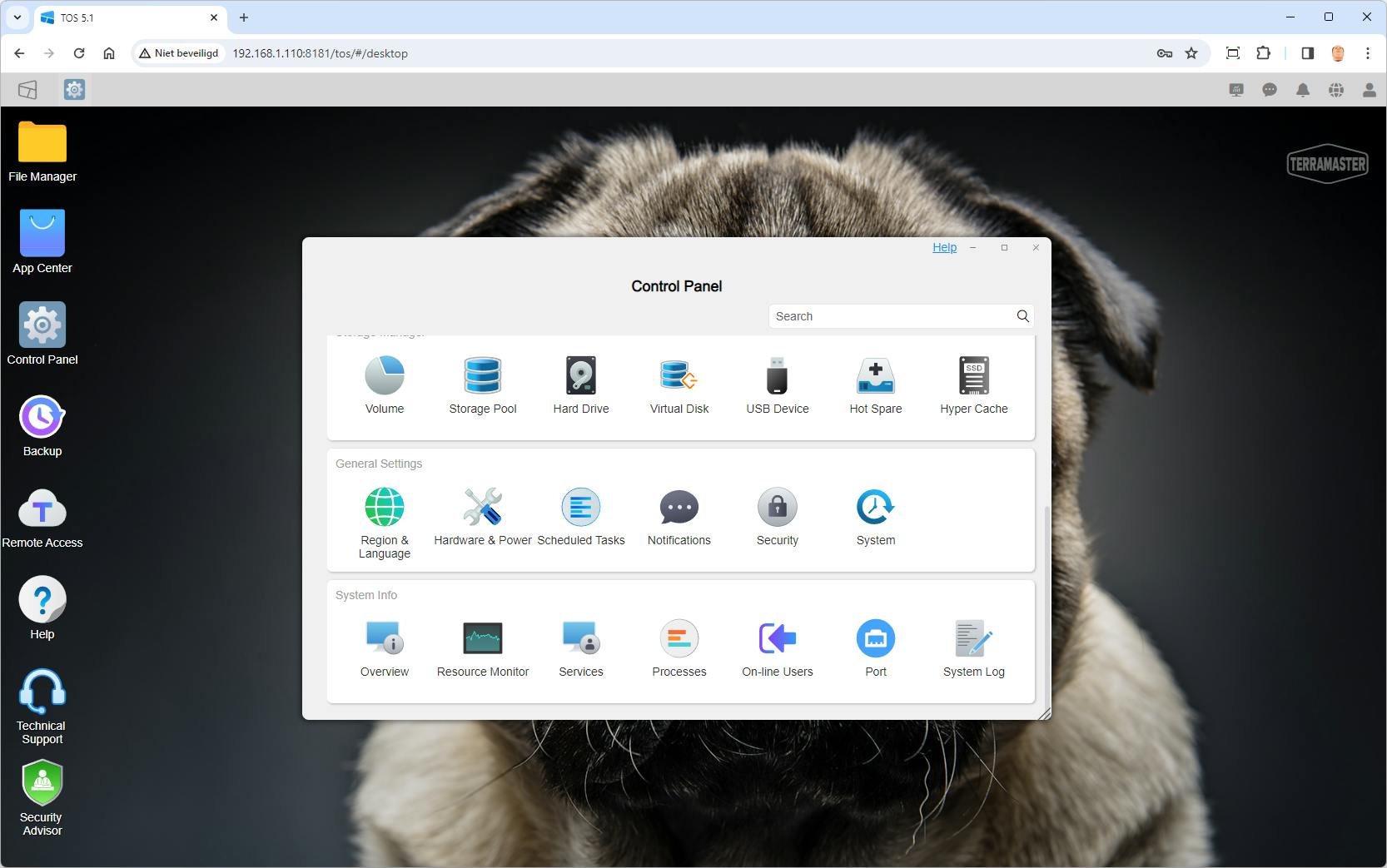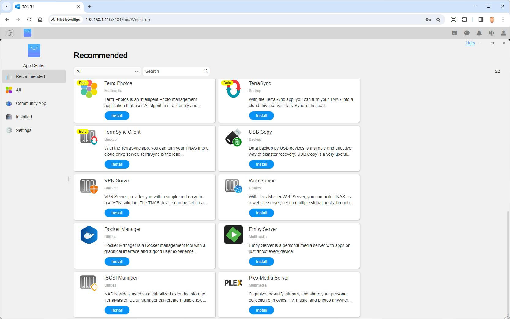 Ook het aantal en de kwaliteit van de uitbreidingen waarmee je functionaliteit toevoegt aan de NAS is beduidend minder dan bij de concurrentie. Er zijn er totaal 59, waarvan een deel zeker goed bruikbaar is, zoals Terra Photo voor fotobeheer en Terra Sync waarmee je een eigen cloud bouwt. Een aantal eigen apps van TerraMaster zoals Centralized Backup en Duple Backup zijn nog bètaversies en daardoor minder snel aan te bevelen. Ook nog bèta is Surveillance Manager voor videobewaking, die moet vooral nog betere ondersteuning bieden van verschillende merken en modellen IP-camera’s en ook betere gebruiksopties krijgen.