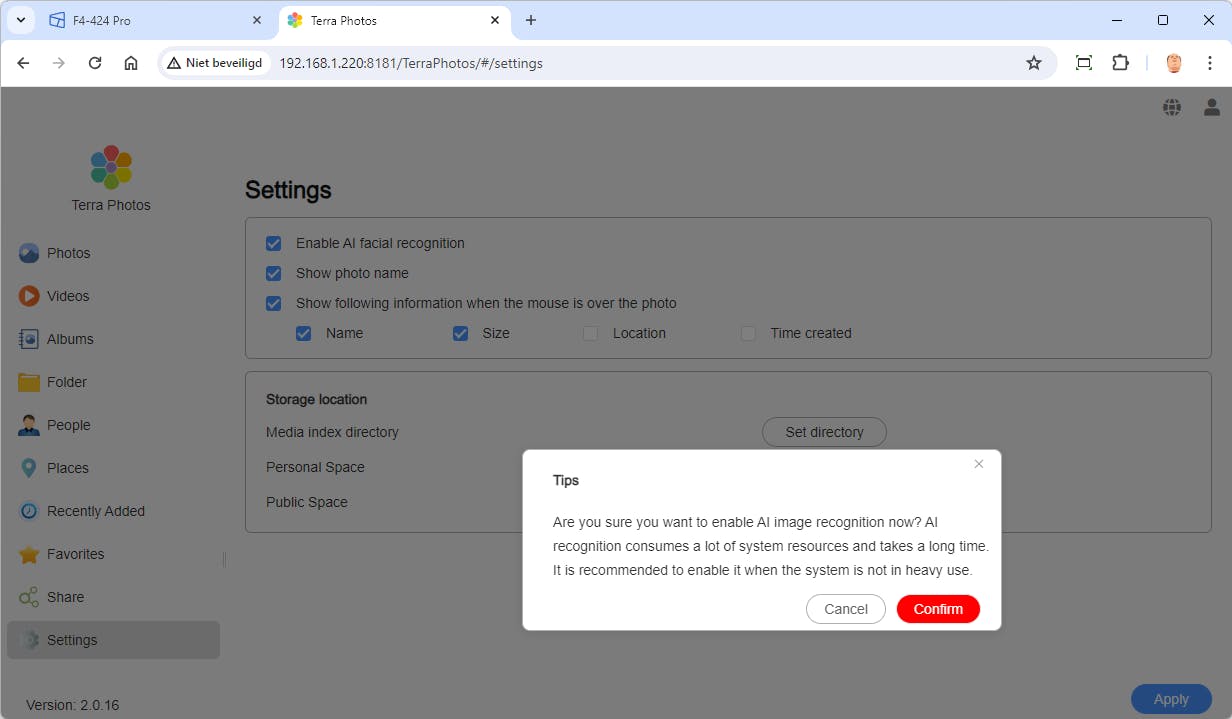 Een TerraMaster-versie van QNAPs HDMI Station is er bijvoorbeeld niet, zodat er helemaal geen toepassing is die de HDMI-poort gebruikt. Ook vreemd is dat wanneer je de media-indexering of gezichtsherkenning in Terra Photo inschakelt, je wordt gewaarschuwd dat dit de NAS fors zal belasten en alleen is aan te raden op momenten dat het systeem licht wordt belast. Gezien die royale hardware kunnen we ons dat bijna niet voorstellen en bovendien zijn dit geen functies die je telkens in- en dan weer uitschakelt.