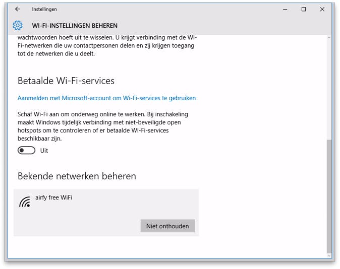 Om een wifi-netwerk in Windows 10 te vergeten, ga je naar Start en klik je op Instellingen / Netwerk & Internet. Klik op het tabblad Wi-Fi en rechts zie je welke wifi-netwerken allemaal beschikbaar zijn. Selecteer onderin Wi-Fi-instellingen beheren en ga helemaal naar beneden naar de sectie Bekende netwerken beheren. Hier zie je met welke netwerken je allemaal verbinding hebt gemaakt. Klik op een netwerknaam en klik op Niet onthouden en je pc zal het netwerk vergeten.
