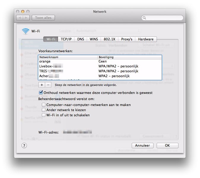 Op de Mac ga je naar Systeemvoorkeuren / Netwerk en klik je op de optie Wi-Fi. Rechtsonder kies je voor Geavanceerd en klik je op het tabblad Wi-Fi. Je kunt zien welk type beveiliging het netwerk gebruikt, het is verstandig om netwerken zonder beveiliging te verwijderen. Dit doe je door het netwerk te selecteren en op het minnetje te klikken. Wil je meerdere netwerken tegelijk verwijderen, hou dan de Cmd-toets ingedrukt. Als je wilt dat netwerken niet meer automatisch worden opgeslagen, dan kun je het vinkje voor Onthoud netwerken waarmee deze computer verbonden is geweest uitzetten.