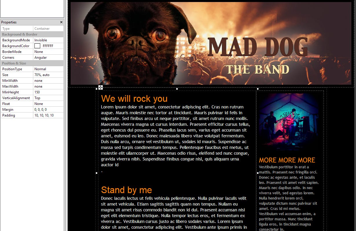 We willen ook een banner of introbeeld toevoegen. Daarvoor plaats je eerst het item Container. In de Properties bij ImageNameklik je op de drie puntjes om het plaatje dat je vooraf hebt klaargemaakt, te selecteren. Als het te groot is, vraagt RocketCake of het de afbeeldingsgrootte mag aanpassen. Dat mag. De titel ‘Mad Dog’ die je bovenaan dit artikel op de banner ziet, hebben we zelf aan het plaatje toegevoegd met een ander programma. In principe kun je ook tekst met het item Floating Text over een afbeelding plaatsen. Dit geeft helaas een onvoorspelbaar resultaat op mobiele apparaten.