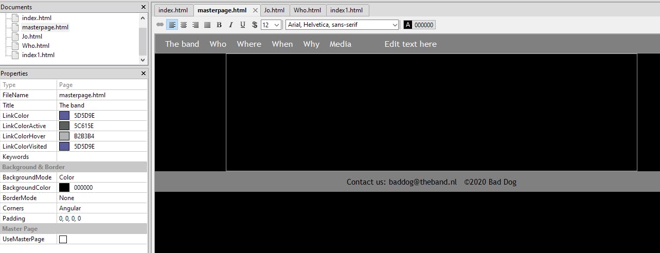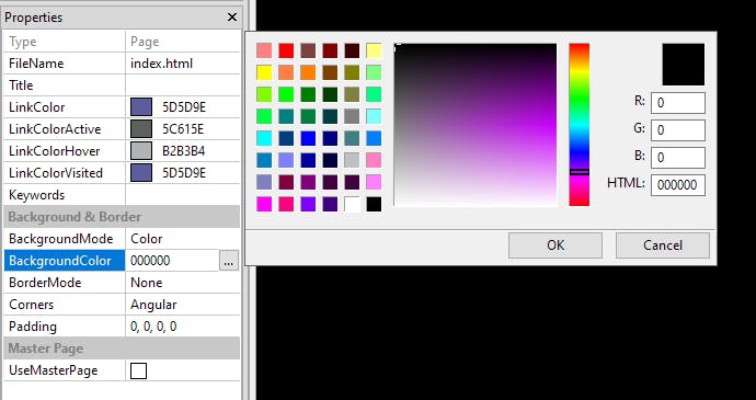 Laten we beginnen met de homepage. In dit voorbeeld maken we de website van een ambitieuze rockband. In plaats van te beginnen met een sjabloon kies je Empty page. Het gedeelte Properties zal zich aanpassen aan ieder element dat je selecteert. Klik bijvoorbeeld op de achtergrond van de eerste pagina, dan kun je bij BackgroundColor een achtergrondkleur selecteren. Standaard staat daar 000000, de html-code voor wit. Door op het vakje met de drie puntjes te klikken hal je de kleurenkiezer tevoorschijn. In de Properties geef je deze webpagina een titel. Die zal straks bovenaan in het browservenster verschijnen. De naam van de homepage laat je op index.html staan. Een browser zoekt altijd naar de index-pagina om als homepage te tonen.