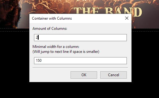 Onder de banner wil je de thuispagina van inhoud voorzien in één, twee of drie kolommen. Daarvoor kies je in Toolset het item Container with Columns. RocketCake vraagt hoeveel kolommen je wilt hebben. Ook wil de applicatie weten wat de minimale breedte is van een kolom. Wij kiezen hier voor twee kolommen en de standaardinstelling 150. Dat betekent dat op een breed scherm de kolommen netjes naast elkaar te zien zijn. Als een kolom op een klein scherm kleiner wordt dan 150 pixels dan zal die niet meer naast, maar onder de vorige kolom verschijnen.