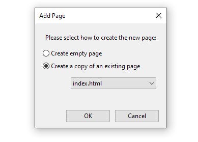 Nu de homepage klaar is, wil je natuurlijk meer pagina’s maken voor je project. Dat gaat met de knop Add Page. Het programma vraagt of je een volledige nieuwe pagina wilt aanmaken of een kopie van een reeds bestaande webpagina. In dit voorbeeld maken we gebruik van de stijl van onze homepage: de zwarte achtergrond, het lettertype, de lettergrootte, de breedte van container… Dus gaan we voor de tweede optie. Daarna halen we de banner weg en wijzigen we de inhoud van de tekstcontainer.