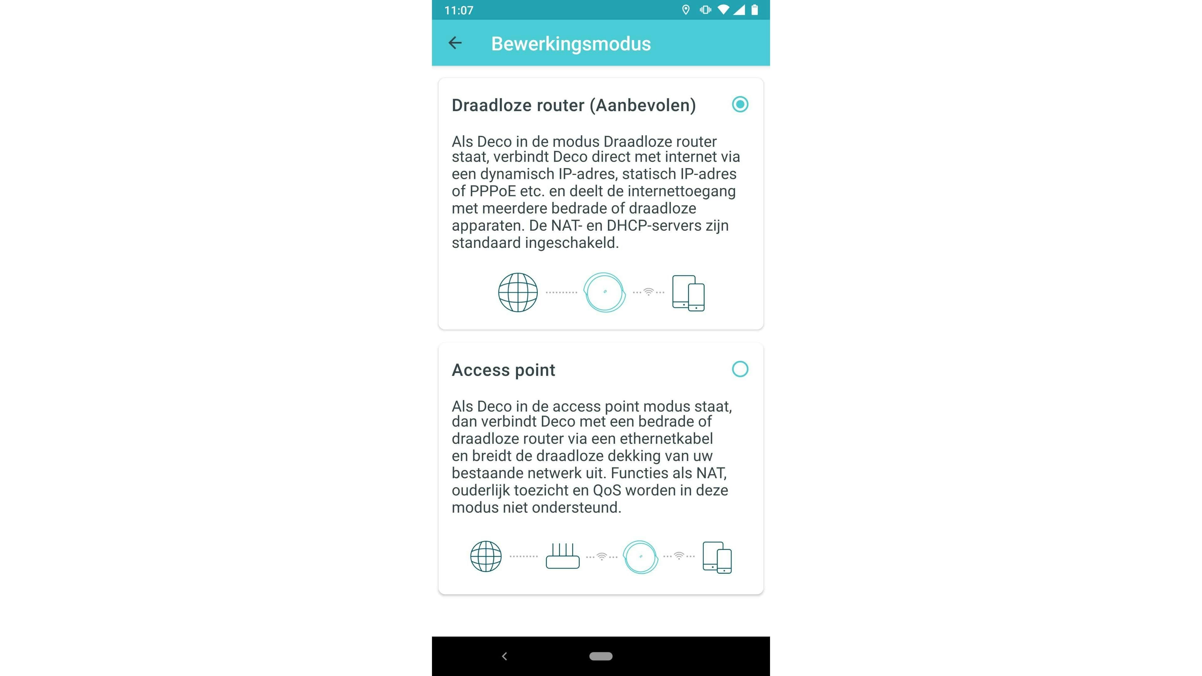 Vanuit de doos werkt ieder wifi-mesh-systeem als router en verzorgt het systeem routertaken zoals het uitdelen van ip-adressen, ouderlijk toezicht en een firewall. Mocht je al een andere router hebben waar je geen afscheid van wilt nemen, dan kun een wifi-mesh-systeem ook instellen in een accesspoint-modus. Alle routerfuncties worden dan uitgeschakeld en alleen het wifi-gedeelte blijft werken. Ook in de accesspoint-modus kun je een bedrade backhaul gebruiken. Een wifi-mesh-systeem laat zich dus ook inzetten als een centraal beheerd bedraad accesspoint-systeem. Voor zover wij weten kan ieder wifi-mesh-systeem – op de systemen van Google na – in accespointmodus gezet worden. Ook Googles nieuwste Nest Wifi Pro ondersteunt geen accesspoint-modus zodra je satellieten koppelt; de accesspoint-modus werkt alleen als je de routernode los gebruikt. En daar koop je vermoedelijk geen wifi-mesh-systeem voor.