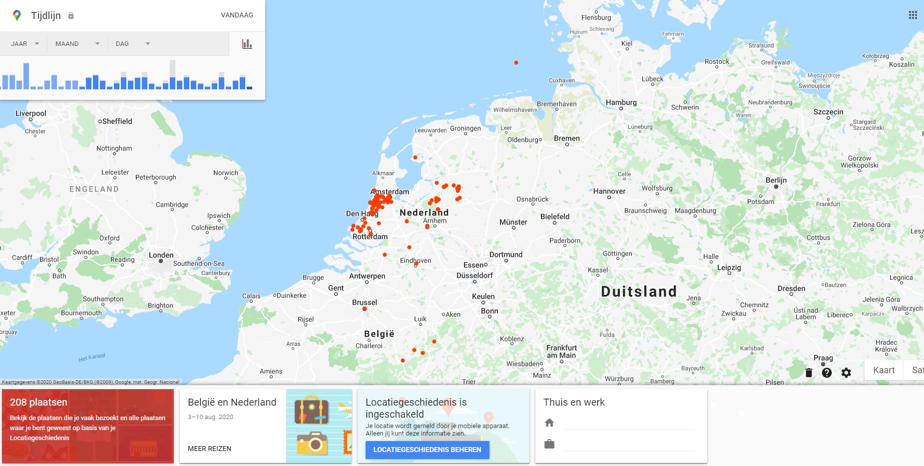 Ga weer terug naar de homepage van de Privacycheck-pagina. Onder het beheren van de Web- en app-activiteiten zie je het linkje Locatiegeschiedenis beheren. Open je deze pagina, dan krijg een kaart te zien met alle plaatsen waar jij de afgelopen tijd geweest bent. Iedere Android-telefoon geeft standaard om de zoveel tijd door waar je bent. Google verzamelt al die gegevens, onder meer om je tips en adviezen op maat te geven. Tegelijkertijd is het bewaren van jarenlange locatielijsten link. Je weet maar nooit in wat voor situatie je ooit belandt waarin dergelijke gegevens zich tegen je kunnen keren. Klik daarom onderaan op Locatiegeschiedenis beheren en zet de schakelaar uit.