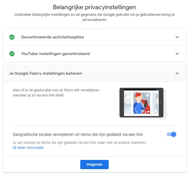 Een van de volgende checks op de pagina Privacycheck is de instelling die onder Je Google-Foto’s-Instellingen beheren staat. Je treft hier namelijk de interessante optie Geografische locatie verwijderen uit items die zijn gedeeld via een link aan. Door de schakelaar hier aan te zetten, weet je zeker dat gedeelde foto’s niet meer de precieze locatie van een opname bevatten. Dat is niet alleen goed voor je privacy, maar voorkomt ook dat het dievengilde interessante waar op die in de huiskamer gemaakte foto ziet, om vervolgens een nachtelijk bezoekje te plannen met vervelende gevolgen. Eigenlijk zou deze schakelaar standaard aan moeten staan, maar het is aan jou om dat te controleren.