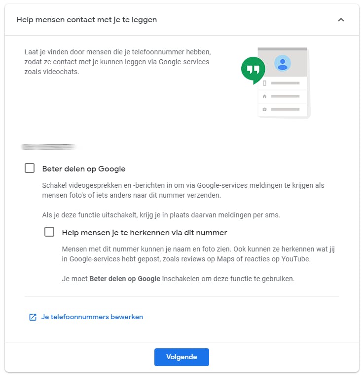 Klik op Volgende om terecht te komen bij de activiteit Help mensen contact met je te leggen. Verzeker je ervan dat alle hieronder genoemde opties zijn uitgeschakeld. Je deelt hier namelijk wel heel gevoelige zaken als je telefoonnummer (of herkenning op basis van je telefoonnummer) mee.