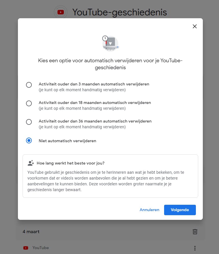 Keer weer terug naar de pagina Privacycheck. Bij veel van de al genoemde links kun je zien wat er aan geschiedenis is bijgehouden en deze (deels automatisch) naar wens wissen. Wis die geschiedenis in ieder geval als je het bijhouden van de geschiedenis van een of ander onderdeel net hebt uitgeschakeld, anders blijven de oude gelogde gegevens nog tot in de eeuwigheid bewaard. Klik onder Je Google-functionaliteit personaliseren bijvoorbeeld onder YouTube-geschiedenis op YouTube-geschiedenis beheren. Klik daar op het vakje Automatisch verwijderen. Kies nu de kortst beschikbare bewaartijd, op het moment van schrijven is dat 3 maanden. Klik op Volgende / Nu verwijderen. Klik tot slot op Bevestigen. Overigens is deze optie alleen beschikbaar als er nooit eerder gegevens opgeslagen zijn. Overigens wordt er in principe niets (meer) toegevoegd aan de geschiedenis als je deze net hebt uitgezet. De ‘3-maanden’-optie is vooral bedoeld voor eenieder die als compromis tussen gebruiksgemak en privacy nog wat historie wil bewaren.
