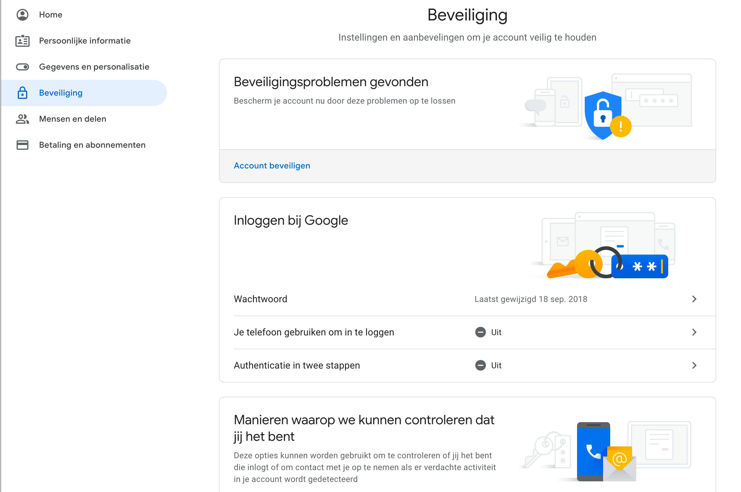 Heb je de volledige wizard op de pagina Privacycheck doorlopen, dan beland je in de accountinstellingen. Klik daar in het menu aan de linkerkant op Beveiliging, je vindt er nog wat interessante zaken. De kans is vrij groot dat je in het paneel rechts de melding Beveiligingsproblemen gevonden, of zelfs Kritieke beveiligingsproblemen gevonden aantreft. Klik hier op Account beveiligen, of in het geval van kritieke problemen op Actie ondernemen. Wat je in die lijst te zien krijgt, zijn veelal zaken waar Google wat extra aandacht voor wil vragen. Bijvoorbeeld of jouw alternatieve e-mailadres en telefoonnummer nog kloppen. Beide zijn nodig in geval je account gekraakt wordt en Google een alternatieve manier van communiceren nodig heeft. Ook word er hier zo af en toe gevraagd of een doorstuuradres (als je dat gebruikt) nog klopt. Ook kun je hier tweestapsverificatie inschakelen. Het betekent wat extra werk bij het inloggen, maar zorgt tegelijkertijd voor een groter gevoel van veiligheid.