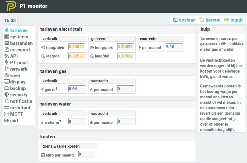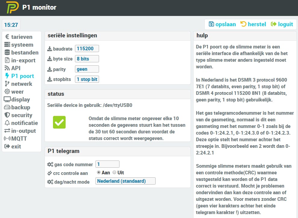 Op het informatiescherm kun je rechtsboven de status voor de P1-poort zien. Als er geen data wordt ontvangen, ga je naar de instellingen. De eerste keer moet je hierbij een wachtwoord opgeven. Bewaar dit zodat je ook in het vervolg in de instellingen kunt komen. Ga vervolgens naar P1 poort waar je de seriële instellingen kunt wijzigen, afhankelijk van jouw type slimme meter. Log dan uit om weer op de verbruikspagina’s te komen. Omdat de slimme meter ongeveer elke 10 seconden de gegevens stuurt, kan het heel even duren voordat je hier daadwerkelijk gegevens binnen ziet komen. Je kunt de status ook nog even op het informatiescherm controleren.