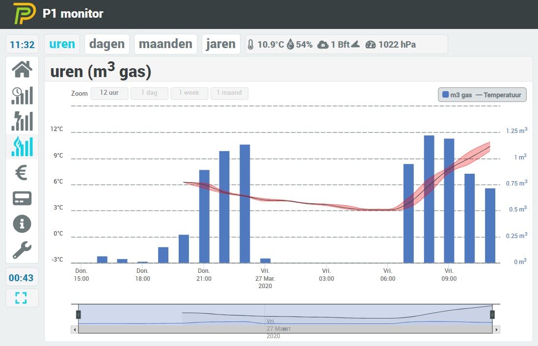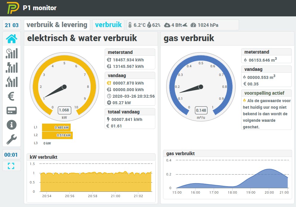 We verlaten de instellingen en gaan terug naar de homepagina van P1 monitor. Hier zie je een overzicht van wat je hebt verbruikt en geleverd. We gaan naar het tweede icoontje dat het actuele verbruik laat zien. Op het eerste tabje zie je hoeveel stroom er op dit moment wordt gebruikt. Zet je bijvoorbeeld de inductiekookplaat aan dan zie je het pijltje voor het stroomverbruik vaak al na enkele seconden omhoog schieten, afhankelijk van wanneer data wordt ontvangen. Onder de grafiek zie je het verbruik van de laatste vier uur. Op het tweede tabje zie je dezelfde details voor stroomlevering. Het derde tabje toont het actuele gasverbruik met grafiek van de laatste vierentwintig uur. Elk tabje toont verder nog een totaal over de hele dag.