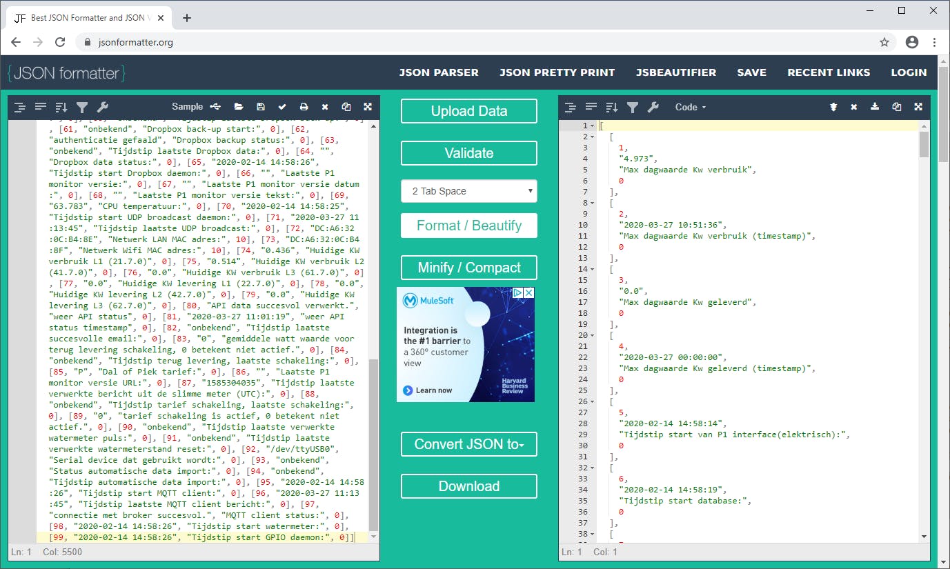 In het kader las je over de api van OpenWeatherMap voor het ophalen van weersgegevens. Op vergelijkbare wijze kun je de metingen van je slimme meter door P1 monitor benaderen vanaf andere systemen, zoals Domoticz of Home Assistant. De toegang tot de api van P1 monitor is relatief eenvoudig. Als je naar instellingen gaat en dan naar het onderdeel API kun je de url’s vinden waarmee gegevens toegankelijk zijn, zoals http://p1mon/api/v1/status. De brei van gegevens kun je wat leesbaarder maken door het te kopiëren en vervolgens te plakken in het linker invoerveld op deze site. Het kan een beetje een puzzel zijn om de gewenste details eruit te filteren of de gegevens weer te geven in een grafiek, bijvoorbeeld met Home Assistant, InfluxDB en Grafana.
