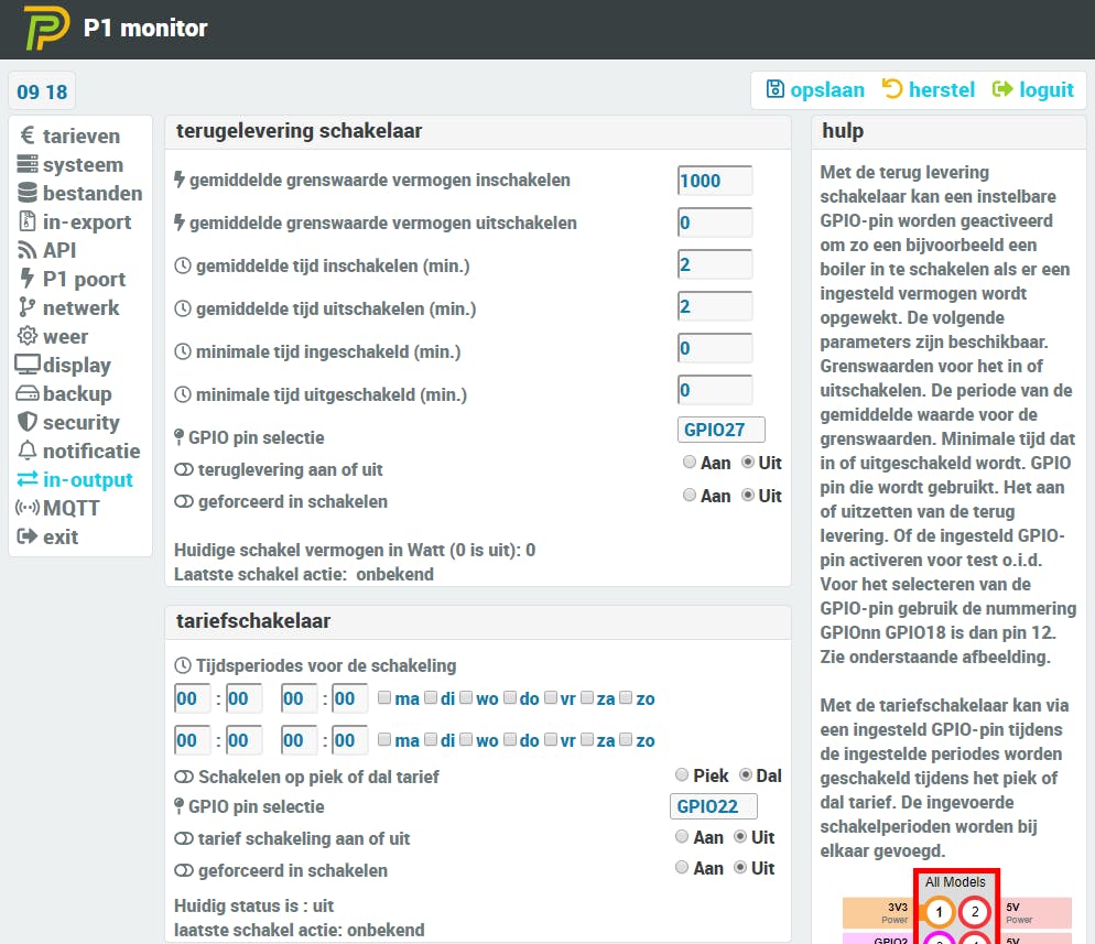 De Raspberry Pi heeft een flink aantal gpio-pinnen voor invoer en uitvoer. Je kunt er binnen P1 monitor enkele gebruiken voor eigen schakelingen. Hiervoor ga je onder instellingen naar in- output. Onder teruglevering schakelaar kun je instellen dat één van de gpio-pinnen moet worden geactiveerd zodra een bepaald vermogen wordt opgewekt door je zonnepanelen. Je kunt dan bijvoorbeeld via een relais een boiler inschakelen. Onder tariefschakelaar kun je schakelen op piek- en dal-tarief. Zo kun je bepaalde apparaten aan- of juist uitzetten afhankelijk van het tarief. Ga wel zorgvuldig te werk bij het schakelen van grote vermogens. Een leuke uitbreiding van P1 monitor, die ook de gpio-pinnen gebruikt, is het meten van je waterverbruik (zie kader).
