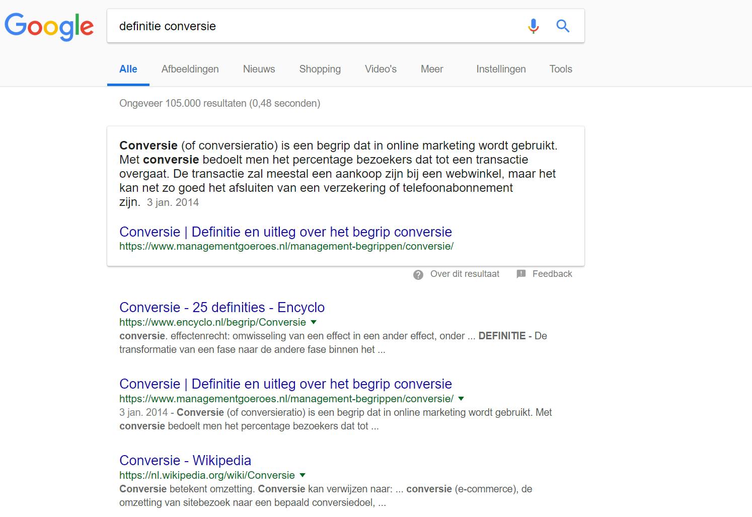 Ben je benieuwd wat een bepaald woord betekent, dan typ je het hoogstwaarschijnlijk gewoon in Google in, waarna je klikt op de eerste de beste link naar een woordenboek. Het kan echter veel sneller, je kunt namelijk ook gewoon aan Google vragen wat het woord betekent. Uiteraard weet Google dat niet zelf, de zoekmachine haalt z’n informatie uit Wikipedia, maar het toont de inhoud rechtstreeks in het zoekresultaat, zonder dat je daarvoor hoeft door te klikken naar een online woordenboek. De vereiste actie? Typen. Typ het woord ‘definitie’ plus het woord waarvan je de betekenis niet weet, bijvoorbeeld: definitie conversie. Als Google het woord kent, en het is geen woord met twintig verschillende betekenissen, dan zal Google direct de betekenis van het woord tonen.