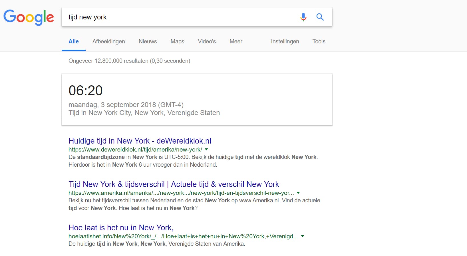 Je kunt op je smartphone en/of smartwatch vrij eenvoudig een wereldklok instellen zodat je altijd kunt zien hoe laat het in een bepaald werelddeel is. Negen van de tien keer heb je die informatie niet regelmatig, maar slechts eenmalig nodig. Stel dat je een telefoontje naar iemand in New York moet plegen, en je je afvraagt of ze daar nog in bed liggen. In plaats van op je smartphone de wereldklok in te stellen, typ je in Google: tijd New York en voilà, je krijgt de datum te zien en hoe laat het daar is op het moment van je zoekopdracht. Zo’n opdracht kun je ook uitbreiden. Stel dat je wilt weten hoe laat het vanmiddag om 16:00 Nederlandse tijd is in New York, dan zoek je op 16:00 CET in New York.