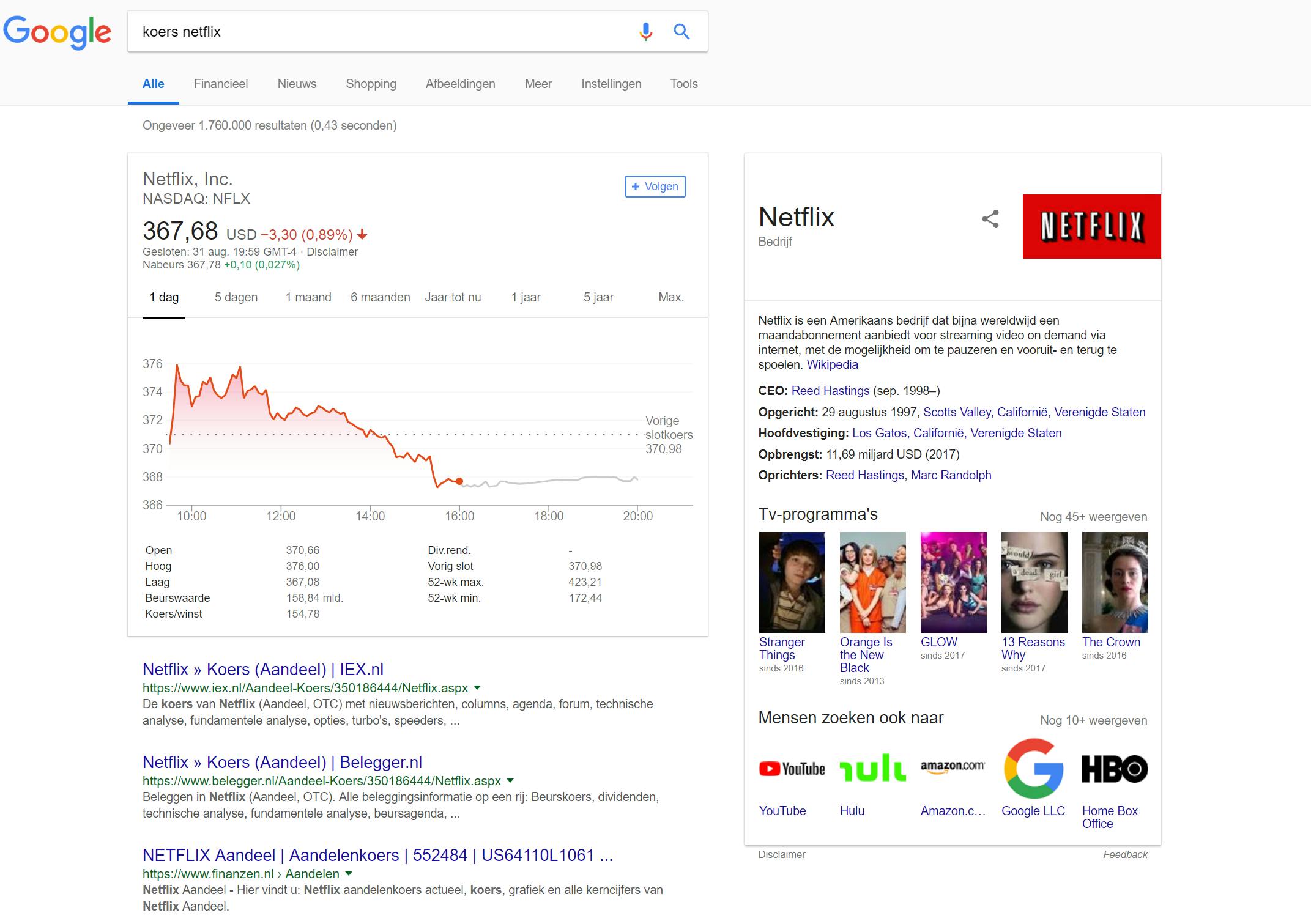 Eerlijkheidshalve zitten we zelf niet in de aandelen, maar zit jij dat wel, en is er iets aan de hand, dan wil je natuurlijk snel te weten komen hoe het met je aandelen zit. In theorie kun je natuurlijk ook gewoon constant een scherm met de huidige koers hebben draaien, maar de meeste mensen die aandelen hebben, zijn daar niet zó actief mee bezig dat ze dat nodig hebben. Stel, je hoort op het nieuws dat er een relletje is ontstaan bij Netflix, en je wilt onmiddellijk weten wat de koers van Netflix is, geef dan in Google in: koers Netflix. Google toont direct een kleine grafiek met de huidige koers van het bedrijf, inclusief het recentelijke koersverloop.