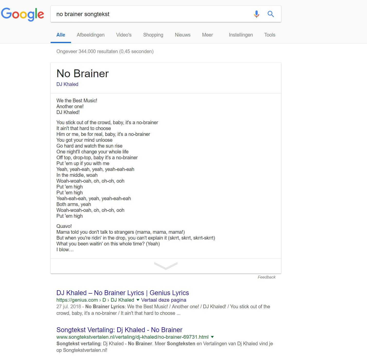 In tegenstelling tot vrijwel alle andere informatie die Google je met behulp van de trucjes in dit artikel toont, is de informatie uit deze tip wel degelijk afkomstig van Google zelf. Toen Google in de smartphone-industrie stapte, is het ook een dienst begonnen voor de verkoop en verhuur van boeken, films, series en muziek. Deze informatie kun je dus heel eenvoudig via Google opvragen, en daarbij horen ook songteksten. Wanneer je voorheen zocht op een songtekst, kwam je terecht in een doolhof van websites die lang niet altijd een nauwkeurige transcriptie vormden. Nu hoef je alleen nog maar de titel van het nummer gevolgd door ‘songtekst’ in te typen, bijvoorbeeld No Brainer songtekst. Niet alleen zie je de complete (kloppende) songtekst, onderaan zie je ook nog eens de informatie van het label dat het liedje heeft uitgebracht. Helaas is het aanbod van Nederlandstalige songteksten nog enigszins beperkt, maar hier komt langzaam maar zeker verandering in.