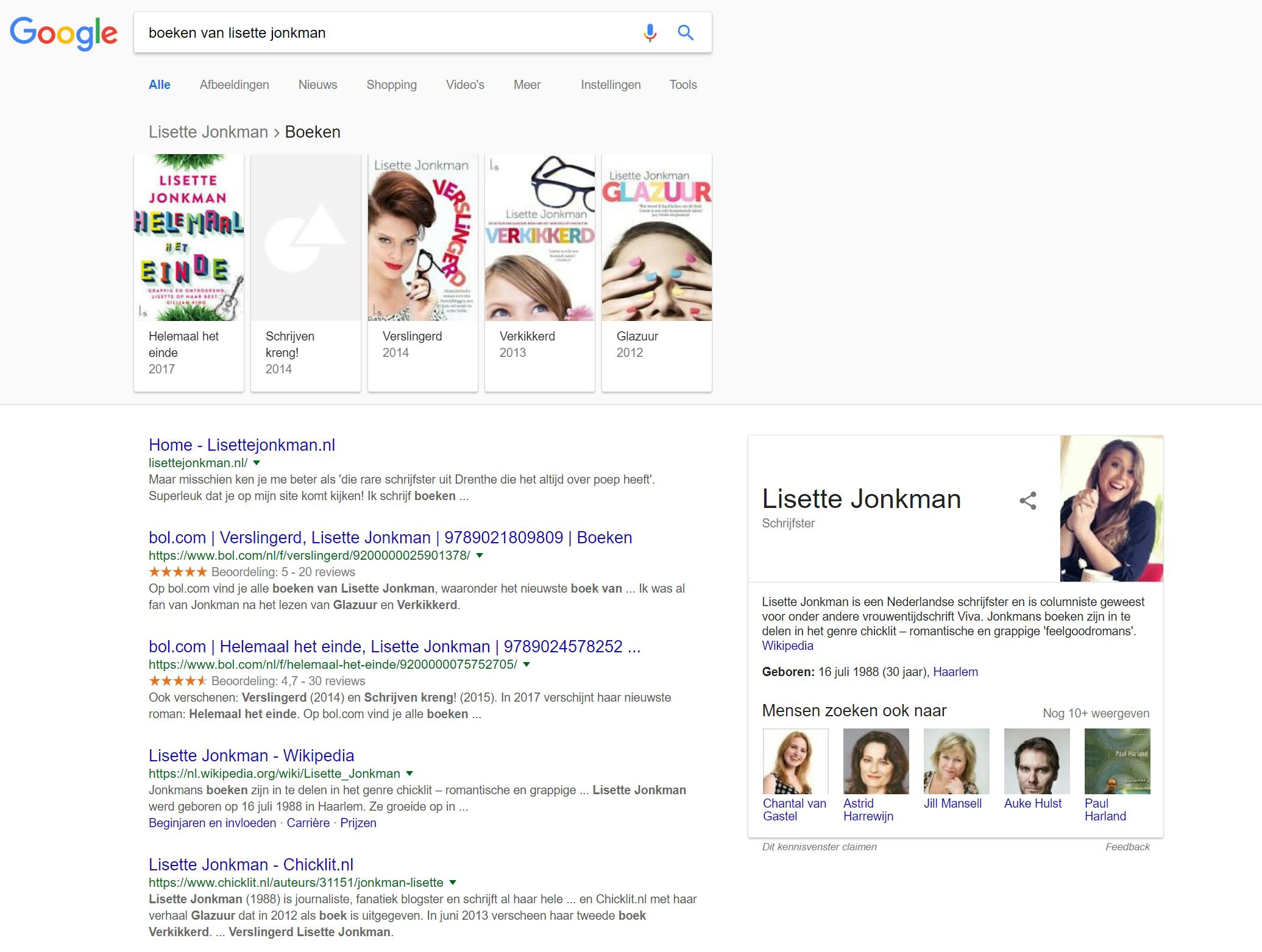 Wanneer je een boek leest waar je enorm gecharmeerd van bent, dan is de kans groot dat je op zoek gaat naar meer boeken van dezelfde auteur of uit hetzelfde genre. Sites als Bol.com en Bruna.nl hebben uiteraard een gigantische database met boeken en auteurs waarin je ongetwijfeld zult vinden wat je zoekt, al kan Google je ook heel eenvoudig van dienst zijn. Stel, je hebt net een boek gelezen van de Nederlandse auteur Lisette Jonkman, en je bent benieuwd wat zij nog meer heeft geschreven. Stel die vraag dan aan Google. Typ bijvoorbeeld: alle boeken van Lisette Jonkman. Als eerste zie je een rij met alle boeken die door Lisette Jonkman, of de auteur van je keuze, geschreven zijn. Je kunt overigens ook zoeken op genre, in dat geval zoek je gewoon op: chicklit boeken, thriller boeken, horror boeken enzovoort. Google schotelt je iedere keer een rijtje met bijpassende boeken voor. Voor meer informatie over dat boek zul je uiteraard moeten doorklikken, tenzij je zelf zoekt op de titel van het specifieke boek, dan toont Google die informatie weer rechtstreeks in de zoekopdracht, ditmaal aan de rechterzijde.