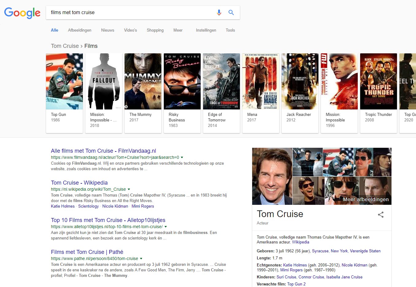 Wat Google met boeken kan, kan het ook met films, maar dan nog wat uitgebreider. Waar je bij boeken in principe alleen kunt zoeken op auteur en genre, kun je bij films veel gedetailleerder zoeken. Zo kun je zoeken op films van Paramount (door letterlijk die drie woorden in te typen) of ook op alle films die geregisseerd zijn door Steven Spielberg, door te zoeken op films van Steven Spielberg. Uiteraard kun je ook op filmgenres of acteur zoeken. Zoek bijvoorbeeld maar eens op films van Tom Cruise, dan krijg je een prima overzicht van zijn oeuvre.