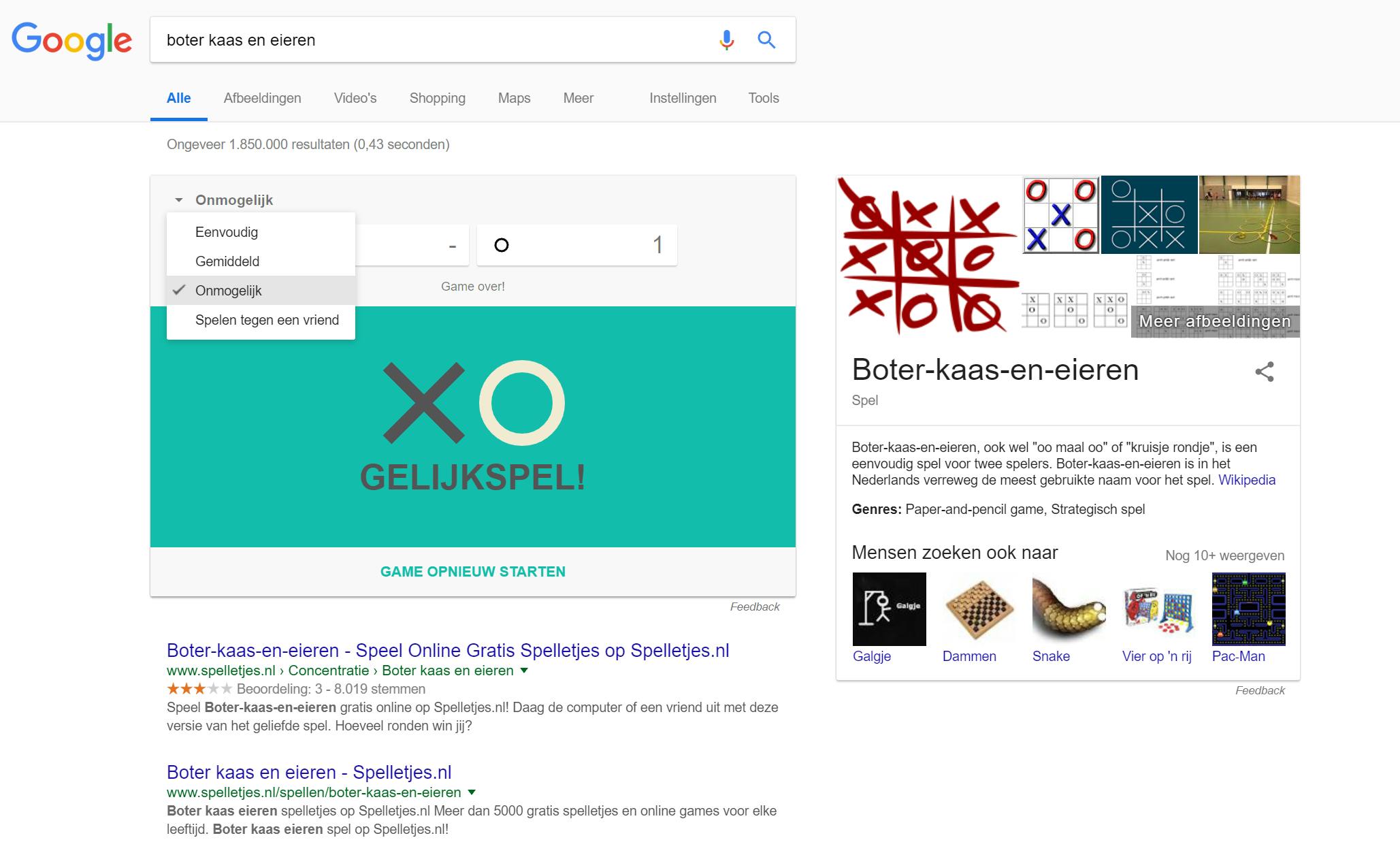 Je zou natuurlijk kunnen stellen dat het spelen van spelletjes geen heel nuttige toepassing van Google is, maar in alle eerlijkheid is een beetje ontspanning af en toe ook heel belangrijk. En zélfs spelletjes kun je in Google spelen zonder de zoekmachine te hoeven verlaten. Typ maar eens Boter, kaas en eieren in. Er wordt direct een spelletje gestart (dat je op de stand Onmogelijk overigens nooit zult winnen van Google). Zoek je op Solitaire, dan kun je ook rechtstreeks vanuit de zoekmachine een spelletje Solitaire spelen. Tot slot, het is dan wel niet echt een spelletje, maar wel ontzettend vermakelijk, het intypen van fun fact. Je krijgt dan een volledig willekeurig weetje van Google te zien (in het Engels), waar je wellicht niets aan hebt in het dagelijks leven, maar wat wel even leuk is om je zinnen mee te verzetten.