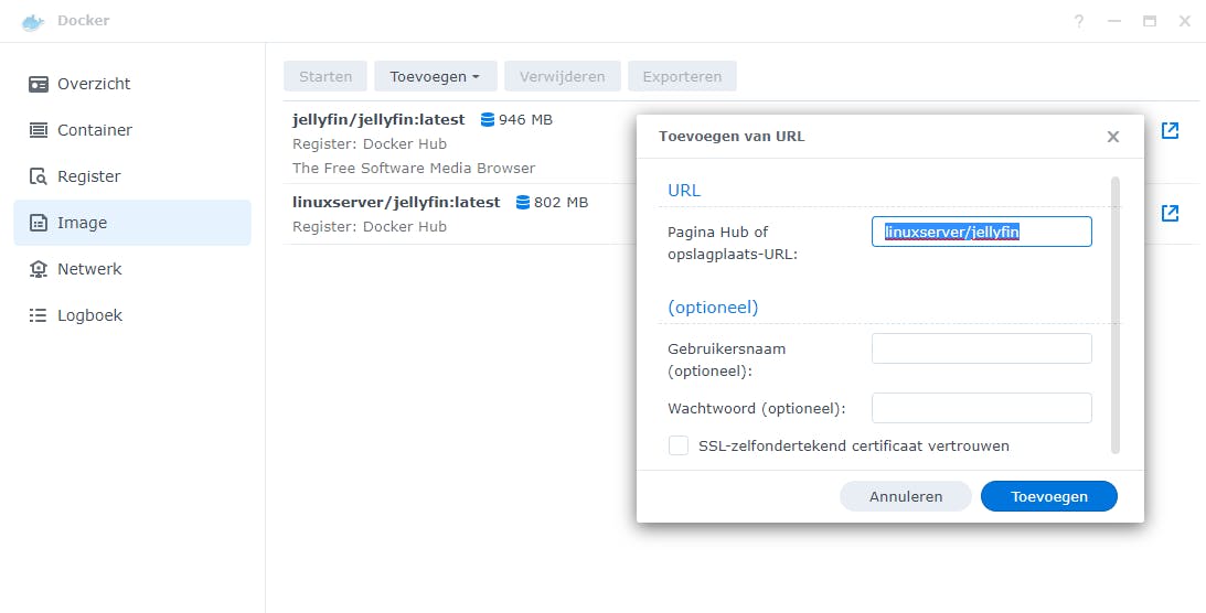 Start de Docker-app in het Synology Package Center, open het onderdeel Image, klik op Toevoegen en kies Toevoegen van URL. Bij Pagina Hub of opslagplaats-URL kun je jellyfin/jellyfin of linuxserver/jellyfin invullen, afhankelijk van de gewenste image-bron. Wij kozen voor de tweede, omdat we goede ervaringen hebben met de Docker-images van de site linuxserver.io: deze zijn gestandaardiseerd, krijgen regelmatig updates en zijn vaak voorzien van degelijke documentatie. In de praktijk maakt het echter niet zoveel uit welke van beide image-varianten je installeert. Voor wie graag experimenteert: je kunt zelfs beide naast elkaar installeren, weliswaar elk op een andere lokale poort.