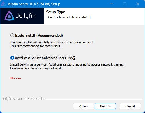 Download het installatiebestand (van de stabiele versie) via Jellyfin Stable Windows Archives en start het met een dubbelklik. Klik op Next en I Agree. In het volgende venster moet je kiezen tussen Basic Install en Install as a Service. Deze laatste is iets handiger aangezien je dan niet bij Windows hoeft aangemeld te zijn om de server toch te kunnen bereiken, maar het maakt het delen van bibliotheken wel iets lastiger (zie ook de volgende paragraaf) en mogelijk werkt hardware-acceleratie dan niet (meer informatie hierover vind je via jellyfin.org.