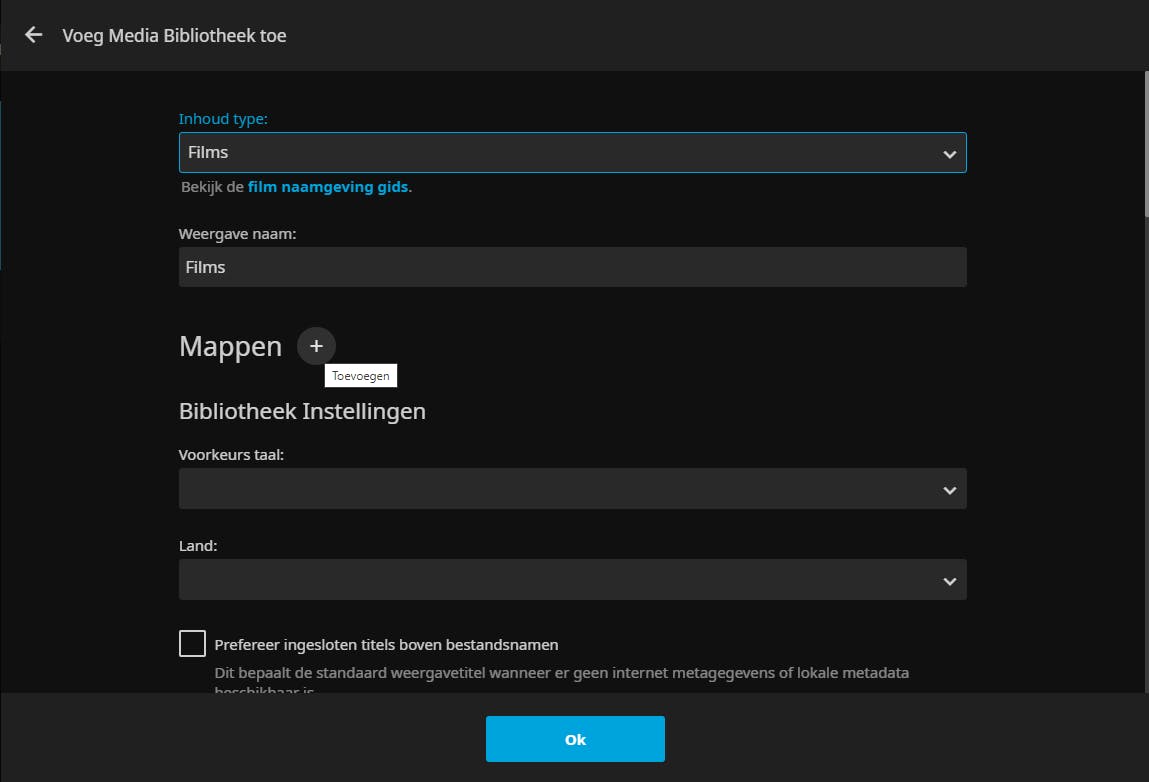 De eerste keer dat je de webinterface van Jellyfin start, moet je nog een en ander configureren. Allereerst wordt om de weergavetaal gevraagd. Standaard staat deze ingesteld op English, maar wij kiezen voor Nederlands. Druk op Volgende en vul de velden Gebruikersnaam en Wachtwoord (2x) in voor het beheerdersaccount. Klik op Volgende voor het beheer van je mediabibliotheken. Klik hier op Voeg Media Bibliotheek toe, duid het beoogde Inhoud type aan, zoals Films, Muziek, Series of Foto’s en vul een Weergave naam in. Klik op het plusknopje bij Mappen en verwijs naar de gewenste mediamap(pen) voor deze bibliotheek. Je kunt hier tevens een UNC-pad naar een gedeelde netwerkmap invullen, zoals \\nas\toon\jellyfin\films.