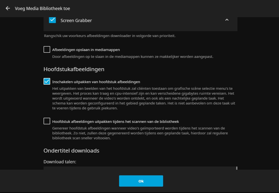 Zo plaats je het best een vinkje bij Prefereer ingesloten titels boven bestandsnamen wanneer de bestandsnamen van je media de bestandsinhoud niet duidelijk genoeg maakt. Plaats je bij Metadata Opslag een vinkje bij Nfo, dan zal Jellyfin de metadata en de afbeeldingen naar de mappen van je media kopiëren in plaats van die in zijn eigen programmamap te bewaren. Vind je zulke NFO-bestanden wat ontsierend, dan laat je dit vinkje beter weg.