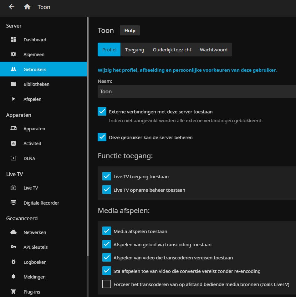 Behalve Dashboard vind je in de linkerkolom onder meer het menu Gebruikers. Hiermee kun je extra personen, zoals andere gezinsleden, toegang geven tot de mediabibliotheken van Jellyfin. Klik hiervoor op de plus-knop naast Gebruikers, vul de velden Naam en Wachtwoord in en plaats een vinkje bij de bibliotheken waar de gebruiker toegang tot mag krijgen. Of je plaatst meteen een vinkje bij de optie Toegang tot alle bibliotheken inschakelen. Bevestig met Opslaan.