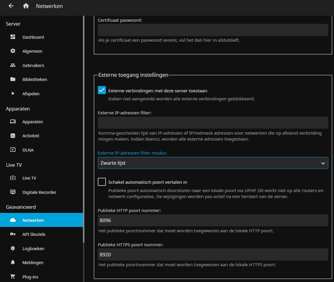 In de rubriek Apparaten / DNLA bepaal je of de Jellyfin-server ook als DLNA-server mag optreden, zodat UPnP-compatibele apparaten op je netwerk door de media kunnen navigeren om deze af te spelen. Bij Standaard gebruiker leg je vast van welke gebruiker de bibliotheken standaard op de aangesloten apparaten moeten worden weergegeven. In de rubriek Geavanceerd / Netwerken kun je onder meer het lokale https-poortnummer aanpassen (standaard is dit 8920) en ook het SSL-certificaatpad evenals het bijbehorende wachtwoord invullen. Is hier de optie Externe verbindingen met deze server toestaan aangevinkt, dan kun je bij Externe IP-adressen filter eventueel nog kwijt welke ip-adressen op afstand met je Jellyfin-server mogen verbinden.