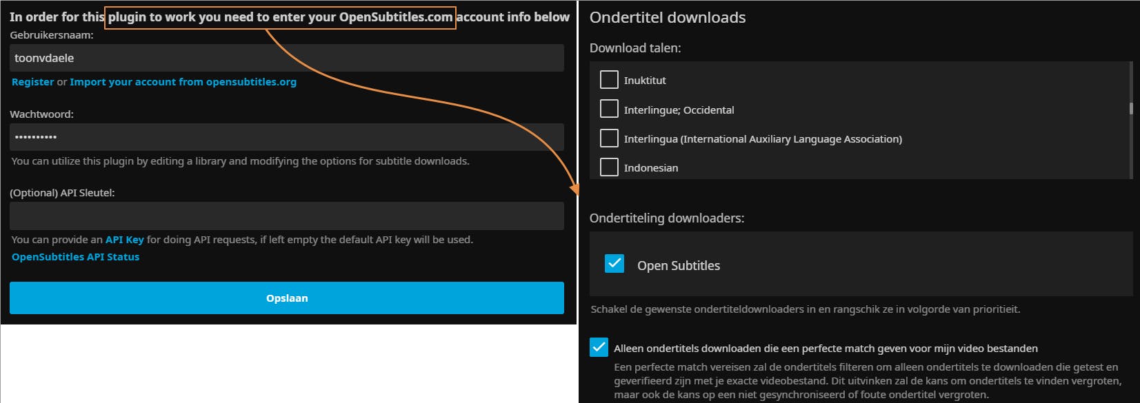We nemen de plug-in Open Subtitles even als voorbeeld. Klik hierop en klik op Install. Herstart je server, ga naar Plug-ins / Mijn plugins en klik op de drie puntjes bij Open Subtitles. Vul je de velden Gebruikersnaam en Wachtwoord in van je account bij www.opensubtitles.com (zonder API kun je tot twintig ondertitels per dag downloaden). Dit regel je via Bibliotheken, waar je bij een filmbibliotheek op de knop met de drie puntjes klikt en Bibliotheek beheren kiest. Na de installatie van Open Subtitles kun je onderaan alle nodige instellingen kwijt met betrekking tot het downloaden en weergeven van ondertitels.