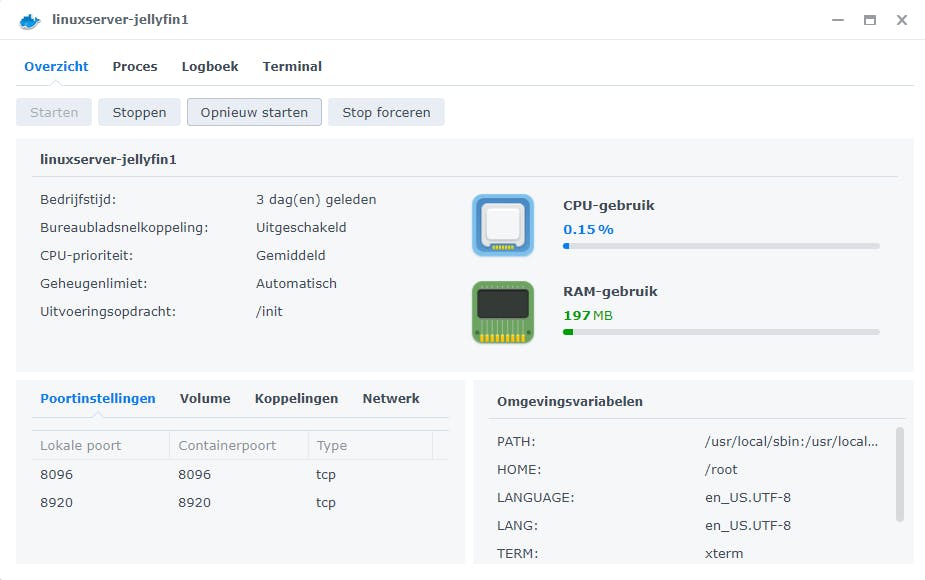 Wellicht staat bij Lokale poort de optie Automatisch ingesteld, wat maakt dat je de Jellyfin-server vanaf je netwerk doorgaans op dezelfde poort als de containerpoort kunt bereiken, maar je kunt hier dus zelf ook een andere lokale poort intikken als je hier de voorkeur aan geeft. Dit hebben wij bij wijze van experiment gedaan om de twee image-varianten op verschillende poorten te laten draaien. Bevestig met Toepassen.