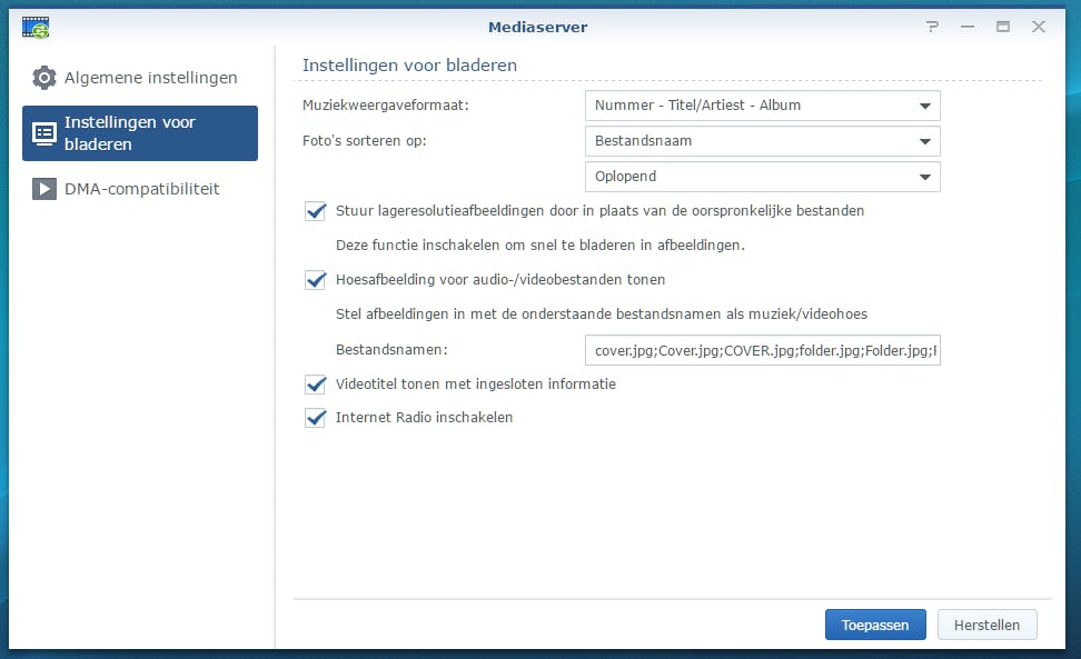 In dat menu regel je overigens ook de media-indexering: verschijnen de mediabestanden niet onmiddellijk in de mediaspeler, dan moet je in dit menu mogelijk de optie ‘Opnieuw indexeren’ aantikken. Verder kun je in de mediaserver de optie ‘Internet Radio’ aanvinken zodat je op het aangesloten media-apparaat ook alles van radioio en Shoutcast kunt beluisteren.