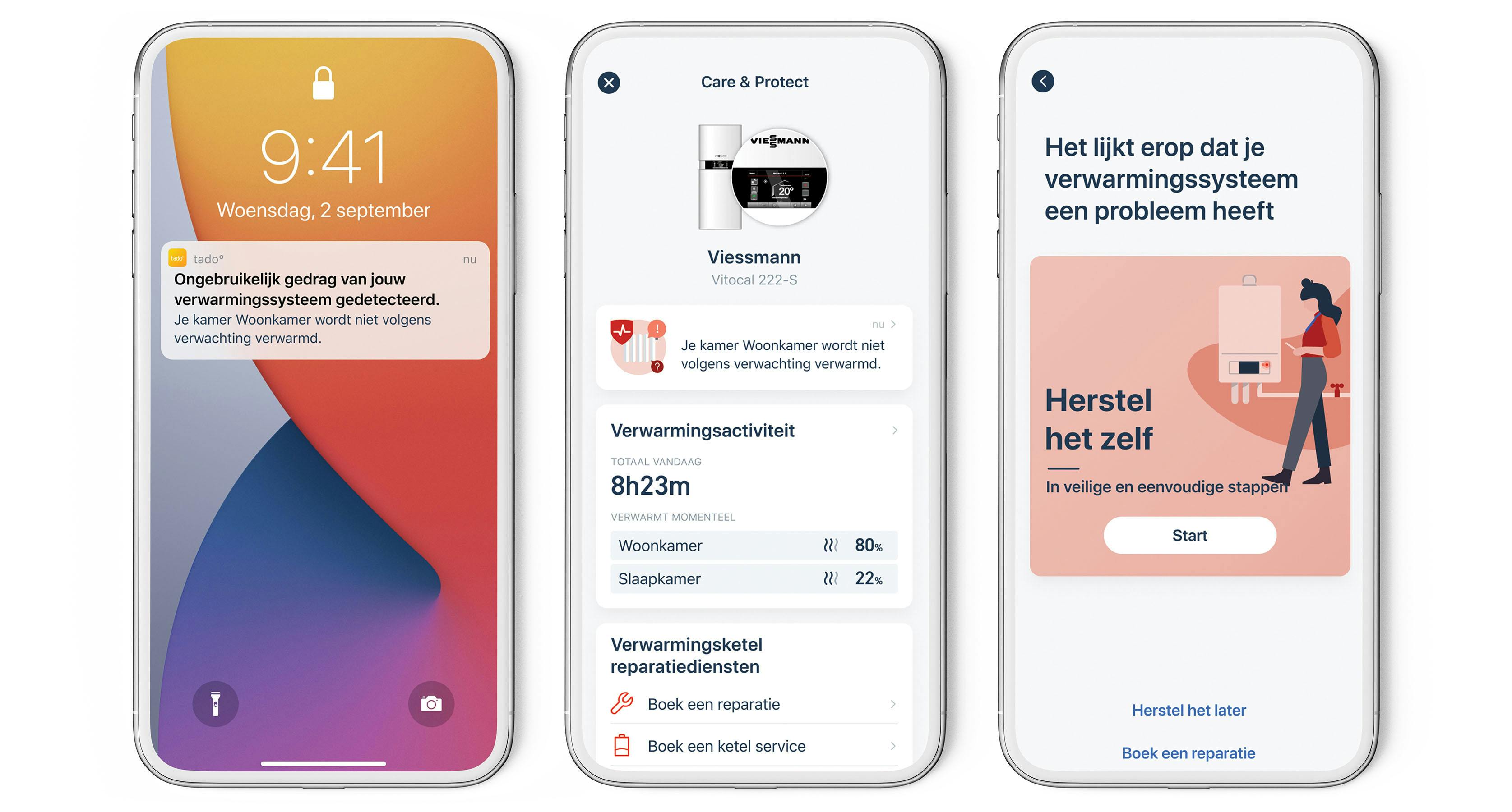 Tado kondigde naast de nieuwe hardware ook een nieuwe dienst aan in de vorm van Care & Protect. Deze nieuwe functionaliteit in de app kan de gebruiker waarschuwen als er een storing is of dreigt te ontstaan, bijvoorbeeld doordat de druk in het cv-systeem daalt of als de ketel is uitgevallen. De app probeert de gebruiker dan te helpen het probleem op te lossen of te laten vorkomen, bijvoorbeeld door een reset of bijvulinstructies. Care & Protect is onderdeel van de Auto Assist-skill die 2,99 euro per maand of 24,99 euro per jaar kost.