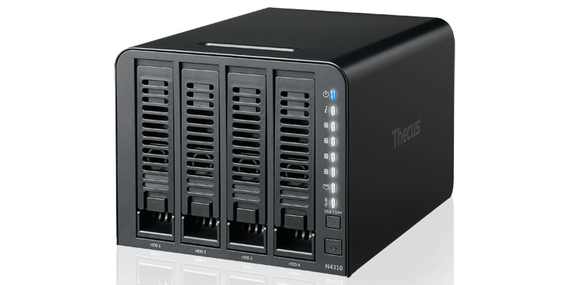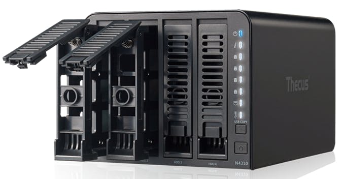Vorig jaar hadden we de N2310 in de test, een nieuw model NAS van Thecus op basis van het eigen ThecusOS met twee schijven. Deze N4310 is daar de grotere broer van met ruimte voor vier schijven en biedt dus naast JBOD en RAID0 en 1 ook RAID5, 6 en 10. De NAS beschikt over een minder bekende APM867 ARM-processor, de enige singlecore processor nog in het testveld. Wel is er met 1 GB dubbel zoveel geheugen als in de N2310, en is er voldoende geheugen voor alledaags en ook wel iets uitgebreider gebruik.