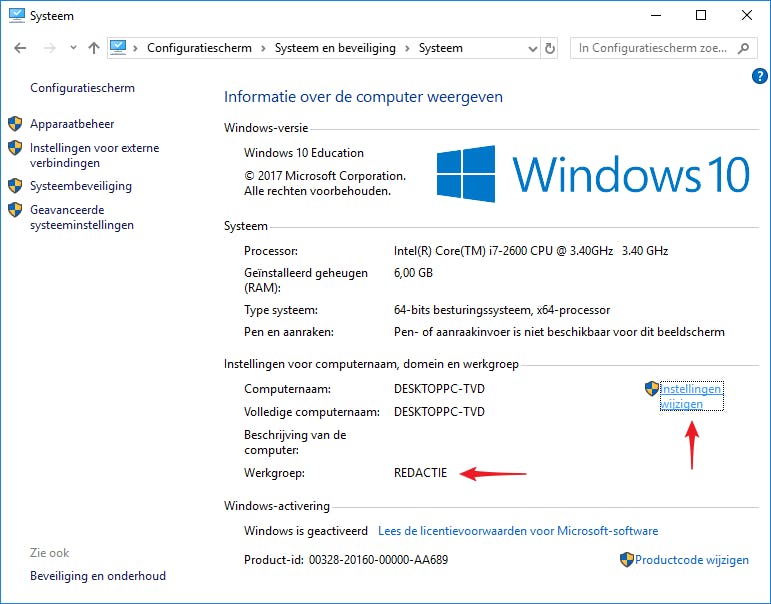 Voordat je gegevens gaat delen, controleer je eerst een aantal instellingen in Windows. Zo zorg je ervoor dat alle betrokken pc’s in dezelfde werkgroep zitten. Dat check je als volgt: klik op Start, tik Configuratiescherm in en start de tool. Kies Systeem en beveiliging / Systeem: je leest de naam af bij Werkgroep. Om die aan te passen klik je op Instellingen wijzigen / Wijzigen en tik je bij Werkgroep de gewenste naam in. Bevestig met OK (2x) en herstart je pc.