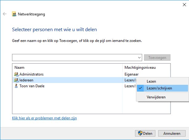 We zijn nu klaar om onze eerste bestanden te delen. Open Verkenner en navigeer naar een map die je via je netwerk wilt delen. Klik die met de rechtermuisknop aan en kies Eigenschappen. Open het tabblad Delen en klik de knop Delen aan. Voor meer deelopties is er nog de knop Geavanceerd delen, maar dat valt buiten het bestek van dit artikel. In het uitklapmenu kies je Iedereen en bevestig je met Toevoegen. In de kolom Machtigingsniveau kun je Lezen desgewenst nog aanpassen in Lezen/schrijven als je wilt dat anderen binnen het netwerk de bestanden ook kunnen aanpassen. En je kunt hier de machtiging eventueel ook weer Verwijderen. Druk op de knop Delen, waarna je meteen het netwerkpad naar de gedeelde map in beeld ziet (\\<computernaam>\<mapnaam>). Als het goed is, komt die zogeheten ‘share’ nu ook beschikbaar via het navigatievenster van de Verkenner, waar je de rubriek Netwerk opent en zo navigeert naar de betreffende pc en map.