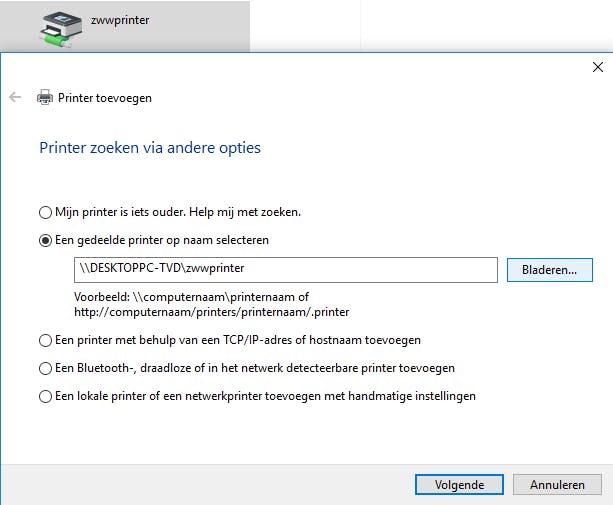 Je kunt een andere computer nu op verschillende manieren met de gedeelde printer verbinden. Dat kan bijvoorbeeld vanuit Verkenner, waar je bij Netwerk de pc met de gedeelde printer opent, de printer met de rechtermuisknop aanklikt en Verbinding maken selecteert. Of je opent Apparaten en printers weergeven en je kiest Een printer toevoegen / De printer die ik wil staat niet in de lijst. Vervolgens selecteer je Een gedeelde printer op naam selecteren en ga je via Bladeren naar de gedeelde printer. Klik op Volgende en voer de verdere instructies uit.