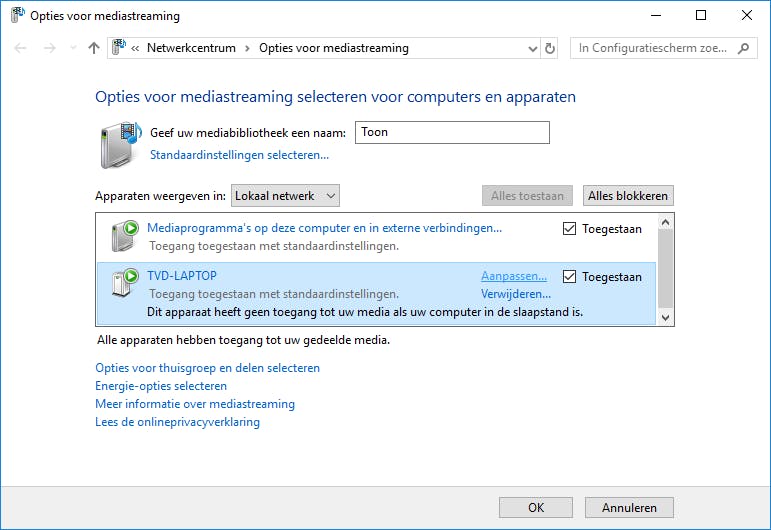 Het is ook perfect mogelijk allerlei media, zoals muziek, afbeeldingen en video’s over het netwerk te streamen, bijvoorbeeld naar een andere pc of naar een of ander afspeelapparaat met netwerkaansluiting. In Windows gaat dat het makkelijkst als volgt. Start Windows Media Player op en klik bovenaan op Streamen / Mediastreaming inschakelen (2x). Geef de mediaserver een naam. Als het goed is zie je meteen ook de ingeschakelde netwerkapparaten verschijnen, zodat je per apparaat de toestemming kunt geven om media vanaf de mediaserver op je pc te streamen, door een vinkje te plaatsen bij Toegestaan. Bevestig met OK en voeg alle gewenste media toe.