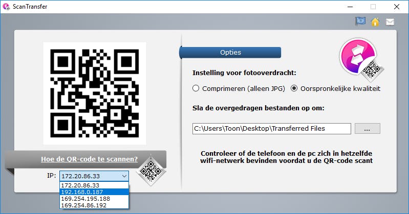 Is het je alleen om fotobestanden te doen, dan is Scan Transfer een handige oplossing. Je installeert de tool op je Windows-pc of je haalt de portable versie op en start het programma. Er wordt nu een lokale webserver opgestart, mogelijk dien je de applicatie de eerste keer even te herstarten. Er verschijnt nu een venster met een of meer ip-adressen: duid hier het interne ip-adres van je pc aan en geef tevens aan of je de foto’s in oorspronkelijke kwaliteit dan wel gecomprimeerd (in jpg) wilt overzetten. Via het knopje met de puntjes bepaal je waar de foto’s worden opgeslagen. Vervolgens scan je de getoonde qr-code in met een geschikte app op je mobiele apparaat. Dit toestel moet zich wel in hetzelfde netwerk als je pc bevinden. Je krijgt nu de pagina van de ScanTransfer-webserver te zien en via Selecteer kies je nu de foto’s die je wilt overzetten. Je hoeft dus geen extra app te installeren op je mobiele apparaat.