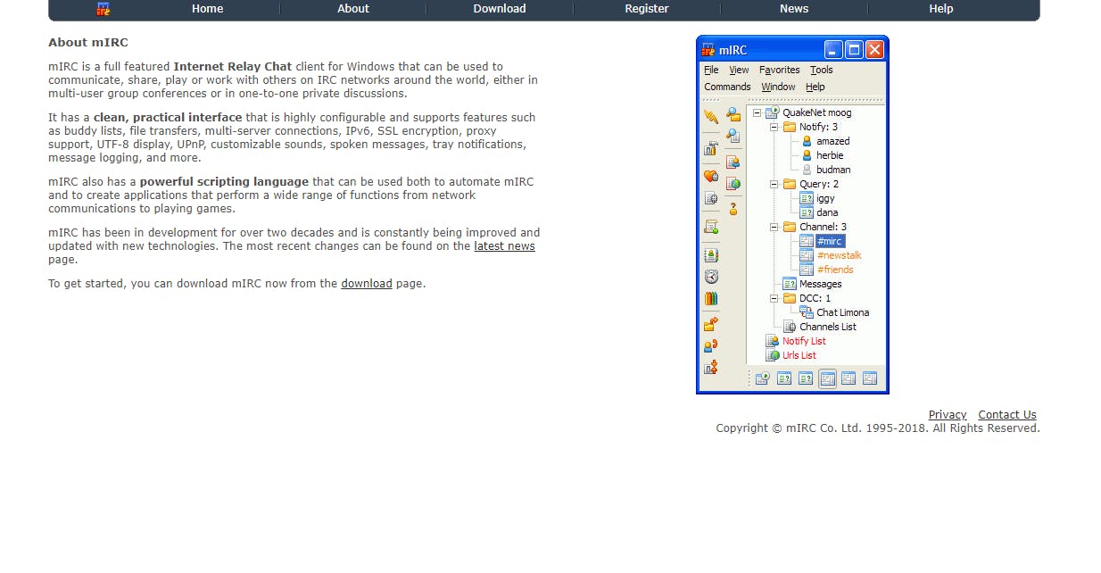 Wellicht heb je nog nooit van IRC gehoord. Toch is het één van de grootste sensaties die de digitale wereld ooit heeft gekend op het gebied van Instant Messaging. Het concept was eenvoudig: je downloadde een programma (een IRC-client) en maakte verbinding met een netwerk. Op dit netwerk vond je vervolgens de wereld aan chatrooms en kanalen, afgestemd op interesses. De populatie van de kanalen kon variëren van enkele zielen tot duizenden gebruikers. Wie eigenaar was van een chatroom genoot een behoorlijke status en geldingsdrang was dan ook aan de orde van de dag. Grote rellen waren er wanneer één van de moderators besloot dat de roem de hoofdmoderator naar het hoofd was gestegen en vervolgens een eigen kanaal startte. Dan moest er een keuze gemaakt worden: aan wie blijf je trouw. Het interessante is dat het vooral een gigantische groep hardcore gebruikers is geweest die zo fanatiek bezig zijn geweest op IRC, terwijl er ook grote groepen mensen zijn die nog nooit van deze vorm van chatten hebben gehoord.